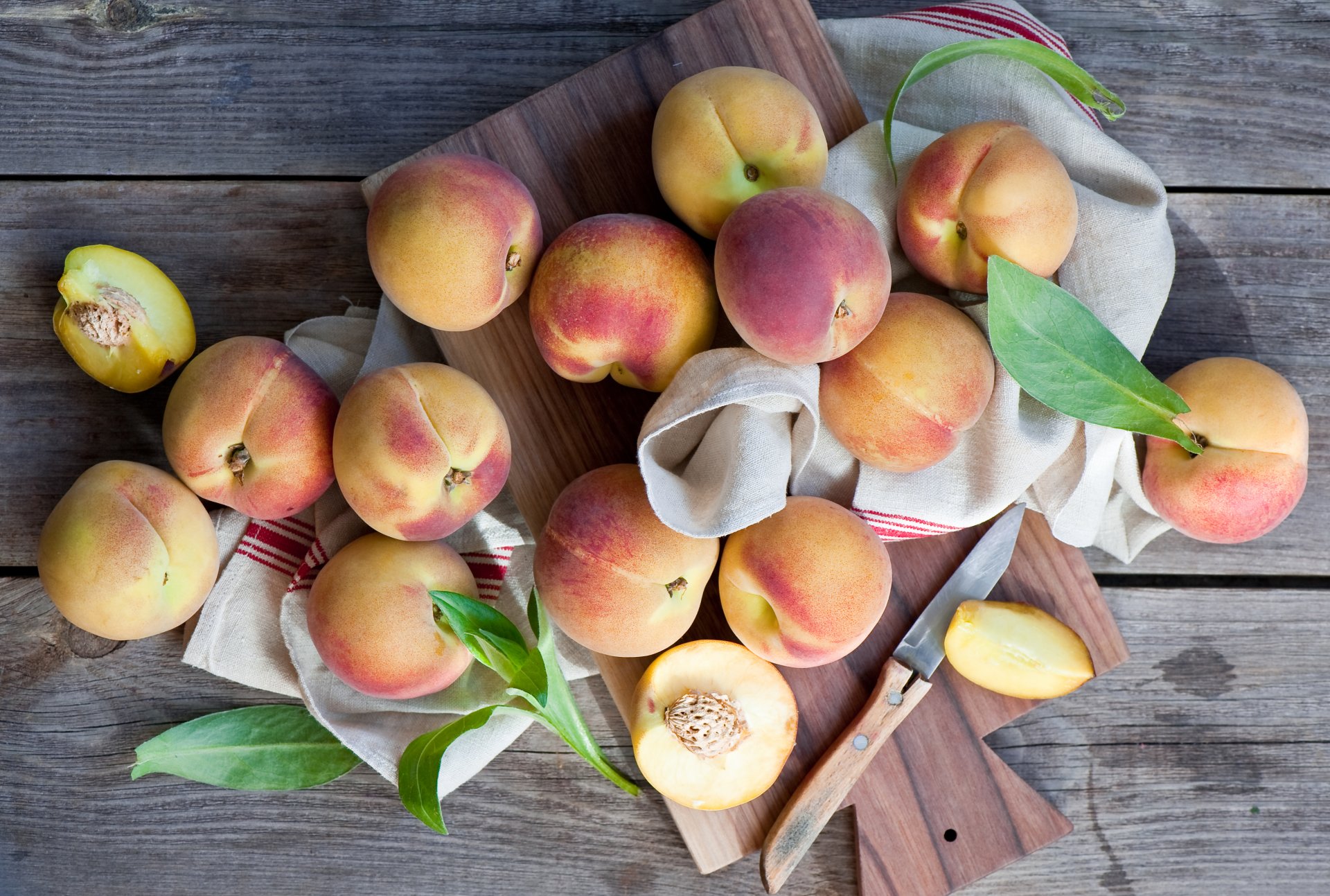 Reife pfirsiche auf einem handtuch warten darauf, geschnitten zu werdenReife Pfirsiche auf einem Handtuch warten darauf, geschnitten zu werden
