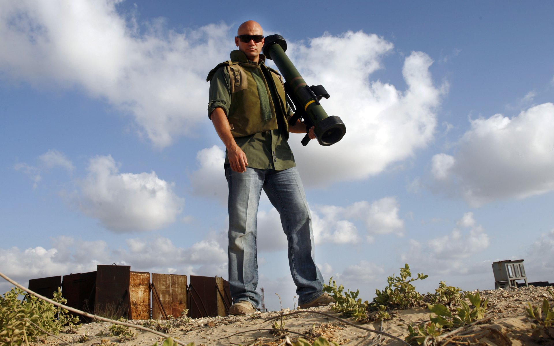 Auf dem boden steht ein mann mit einer großen kanone auf der schulterAuf dem Boden steht ein Mann mit einer großen Kanone auf der Schulter
