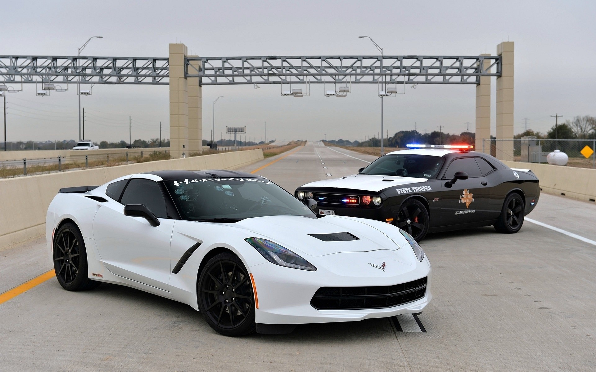 Zwei Sportwagen auf der Strecke. Weiße Rennsport- und Polizeikorvette