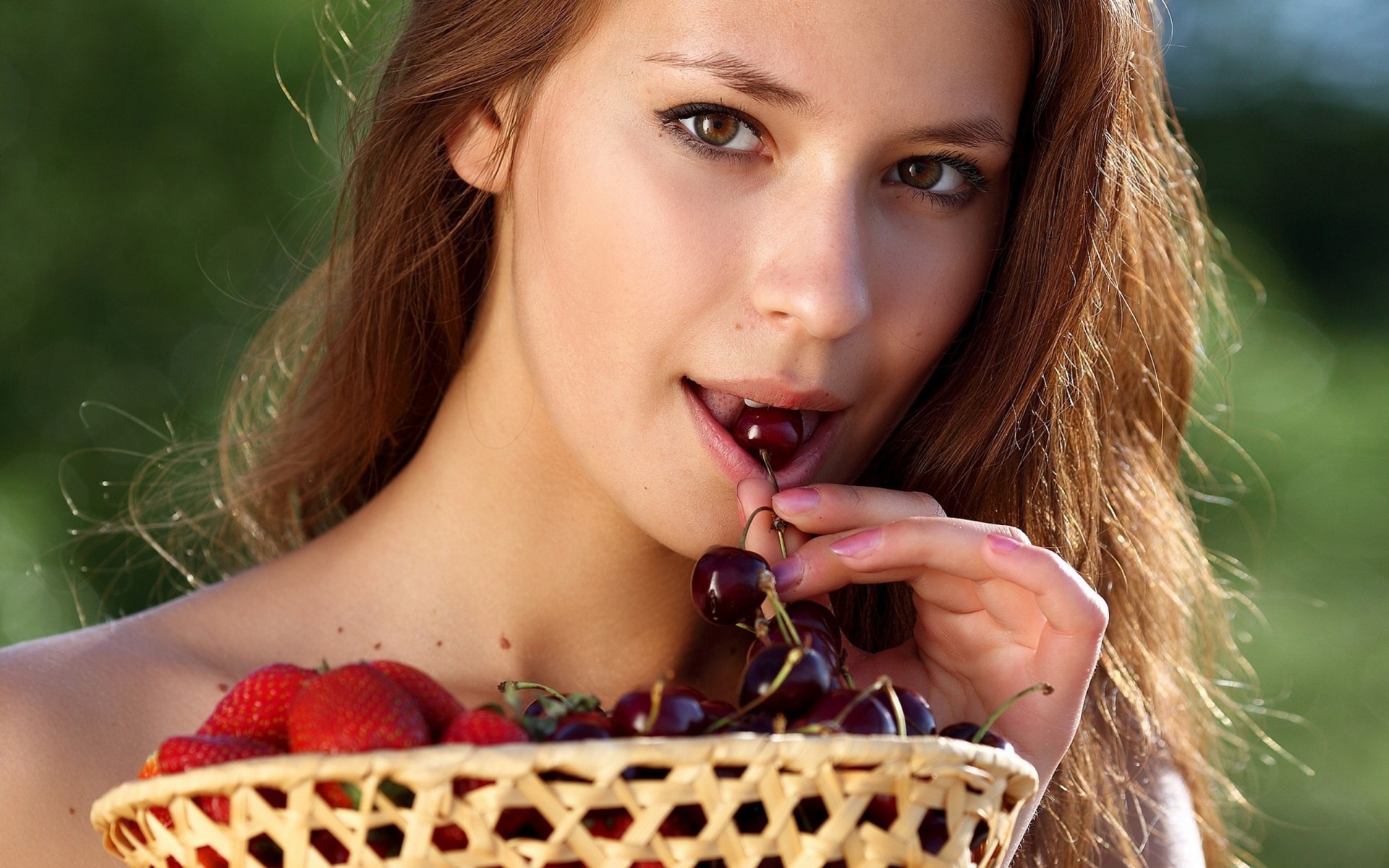 Mädchen mit einem korb mit erdbeeren und kirschen im mundMädchen mit einem Korb mit Erdbeeren und Kirschen im Mund