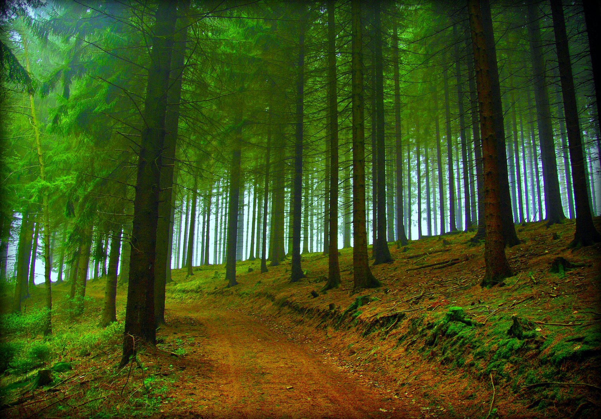 Ein Weg durch den Nebel, der durch einen Hain führt
