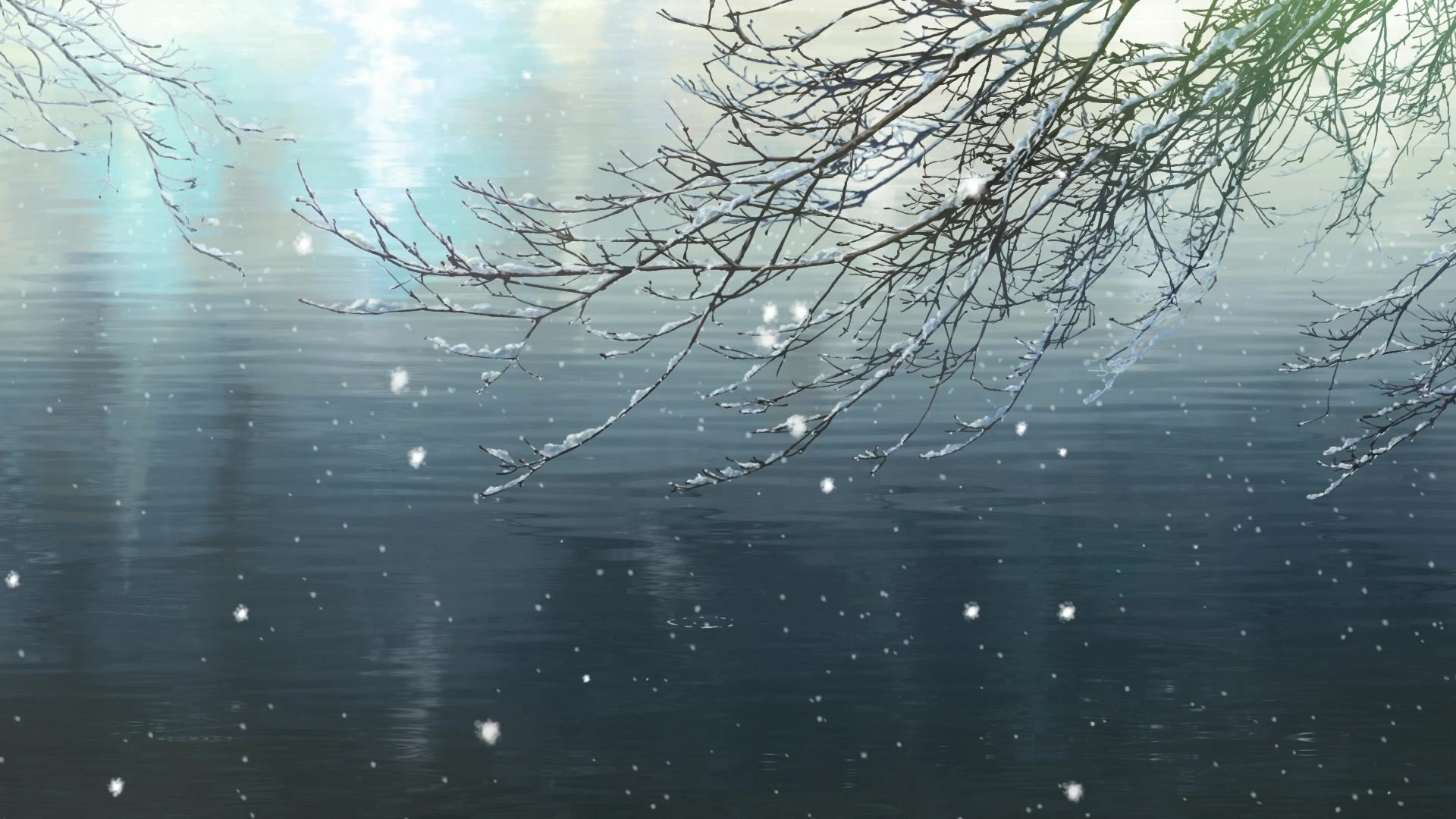 Ein schneebedeckter ast über einem teich im gartenEin schneebedeckter Ast über einem Teich im Garten