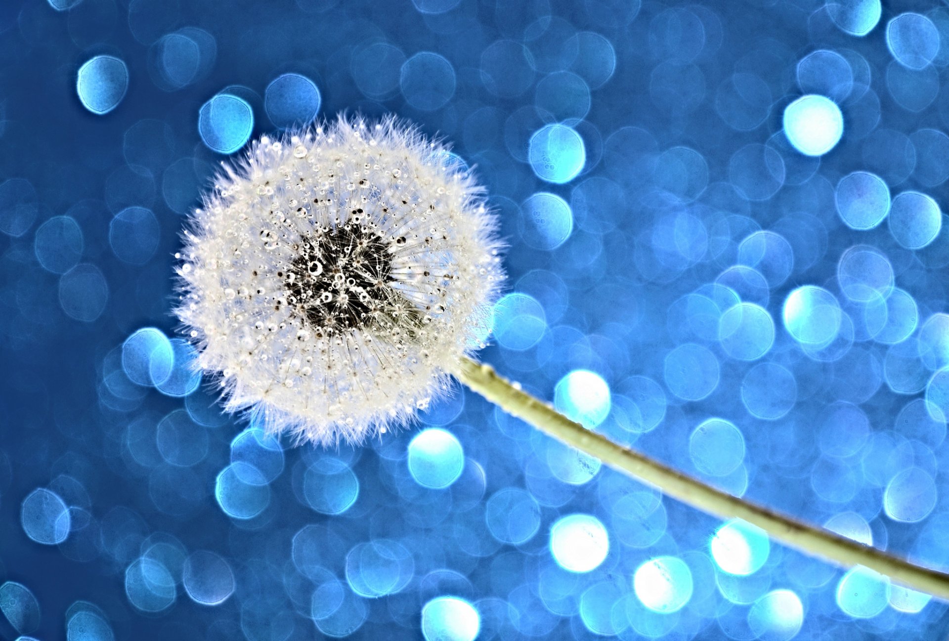 Tautropfen auf weißem Löwenzahn mit Highlights