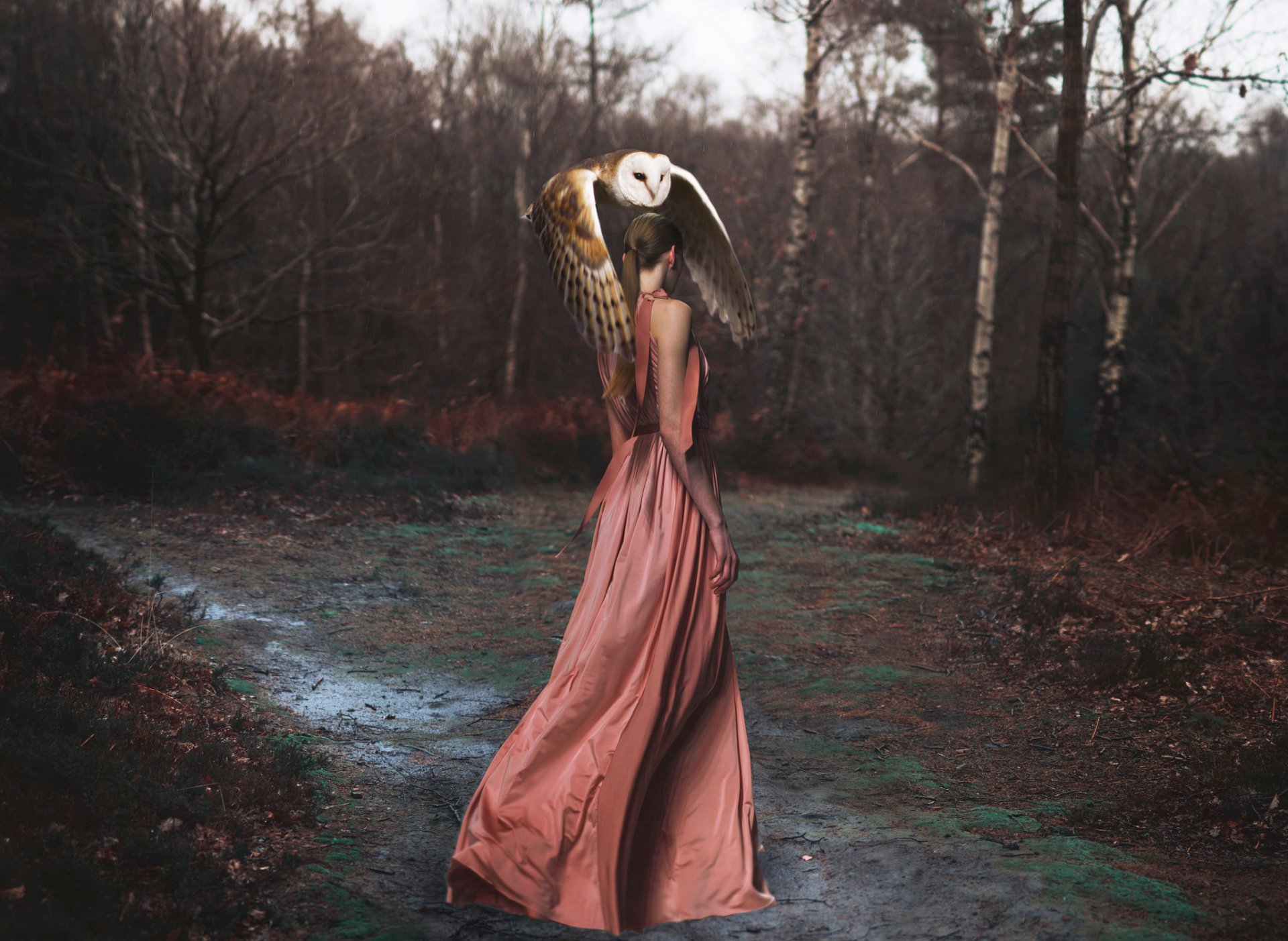 Mysteriöses foto eines mädchens in einem rosa kleid im wald mit einer euleMysteriöses Foto eines Mädchens in einem rosa Kleid im Wald mit einer Eule