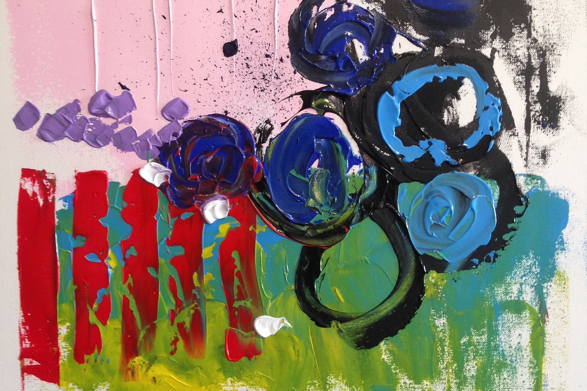 Abstraktes Bild mit rotem Zaun und schwarzen und blauen Kreisen
