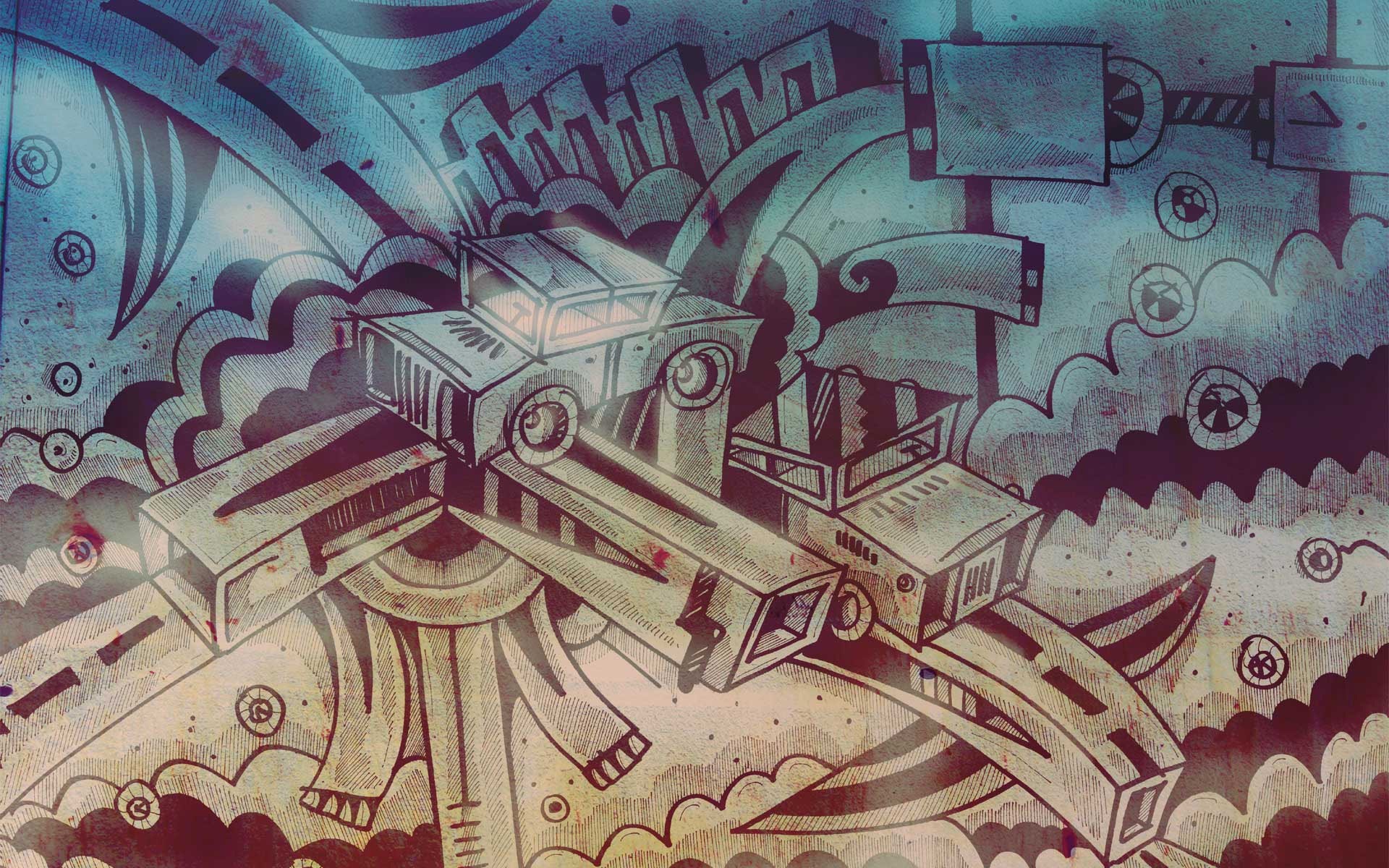 Vögel kreisen in der Dunkelheit über der goldenen Maschine