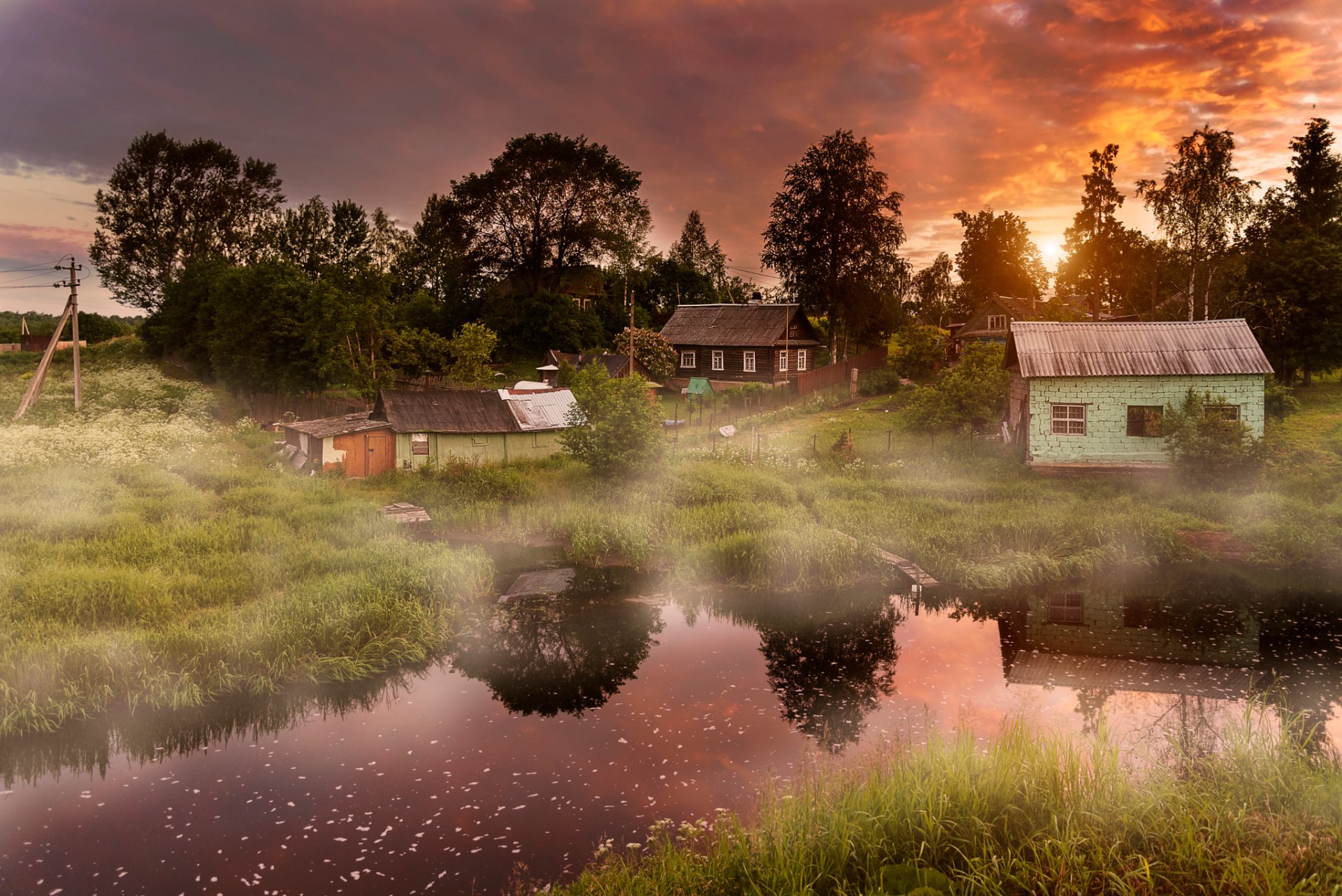 Morgendämmerung auf dem Feld am Morgen im Dorf