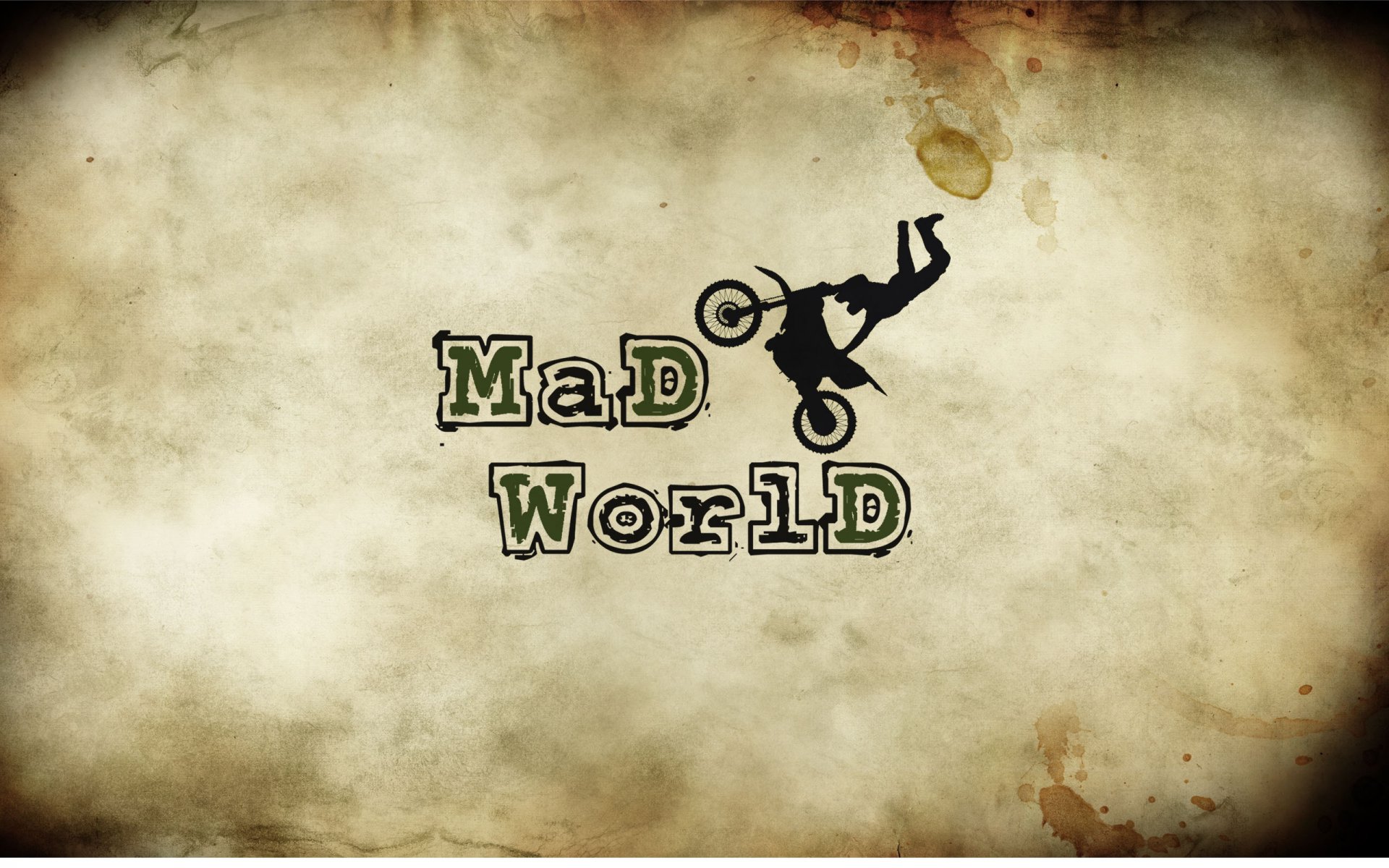 Ein Bild eines Mannes, der auf einem Motorrad auf seinen Händen steht, mit der Aufschrift "Verrückte Welt"