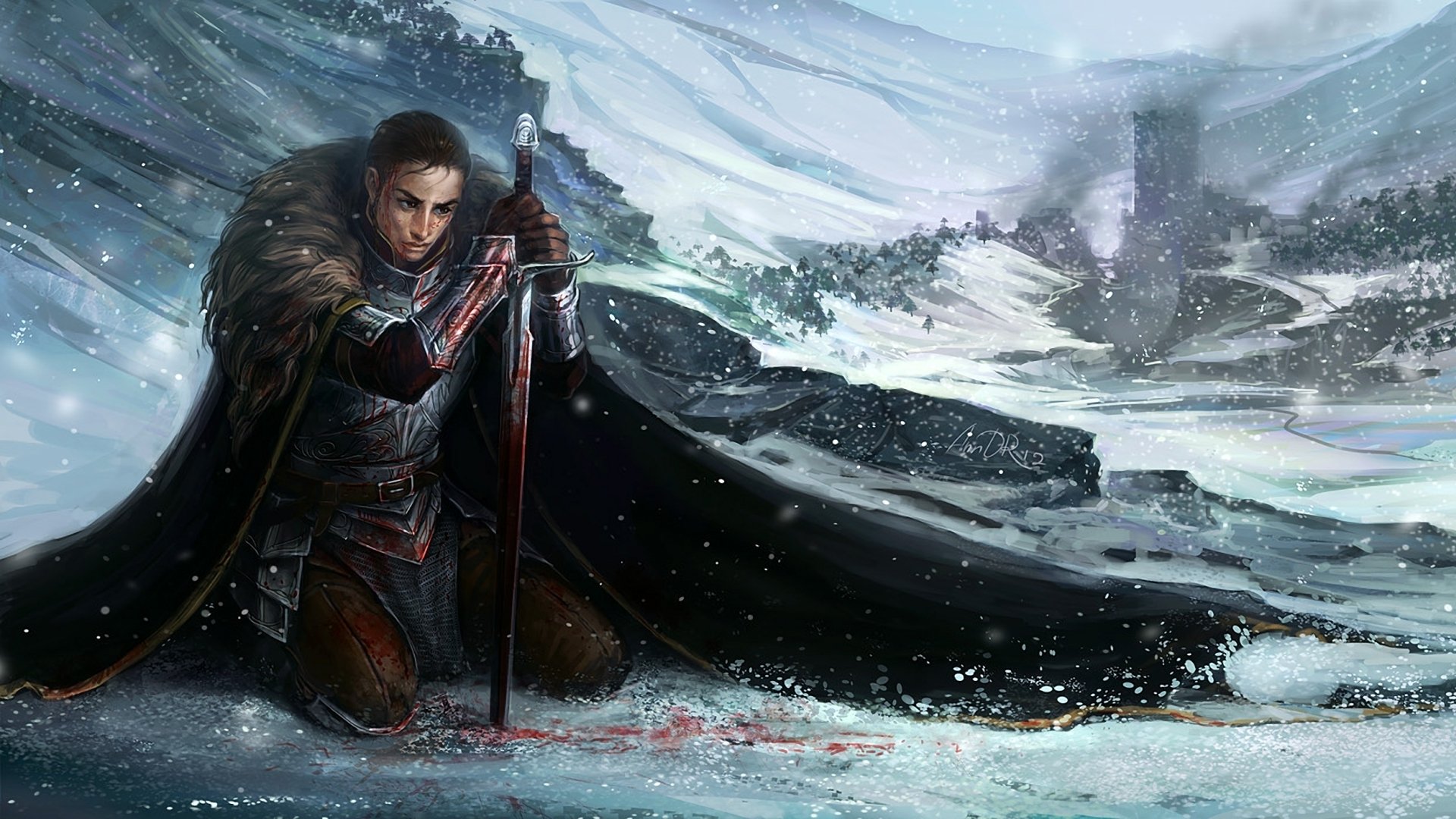 Krieger in rüstung und schwert auf winterhintergrundKrieger in Rüstung und Schwert auf Winterhintergrund