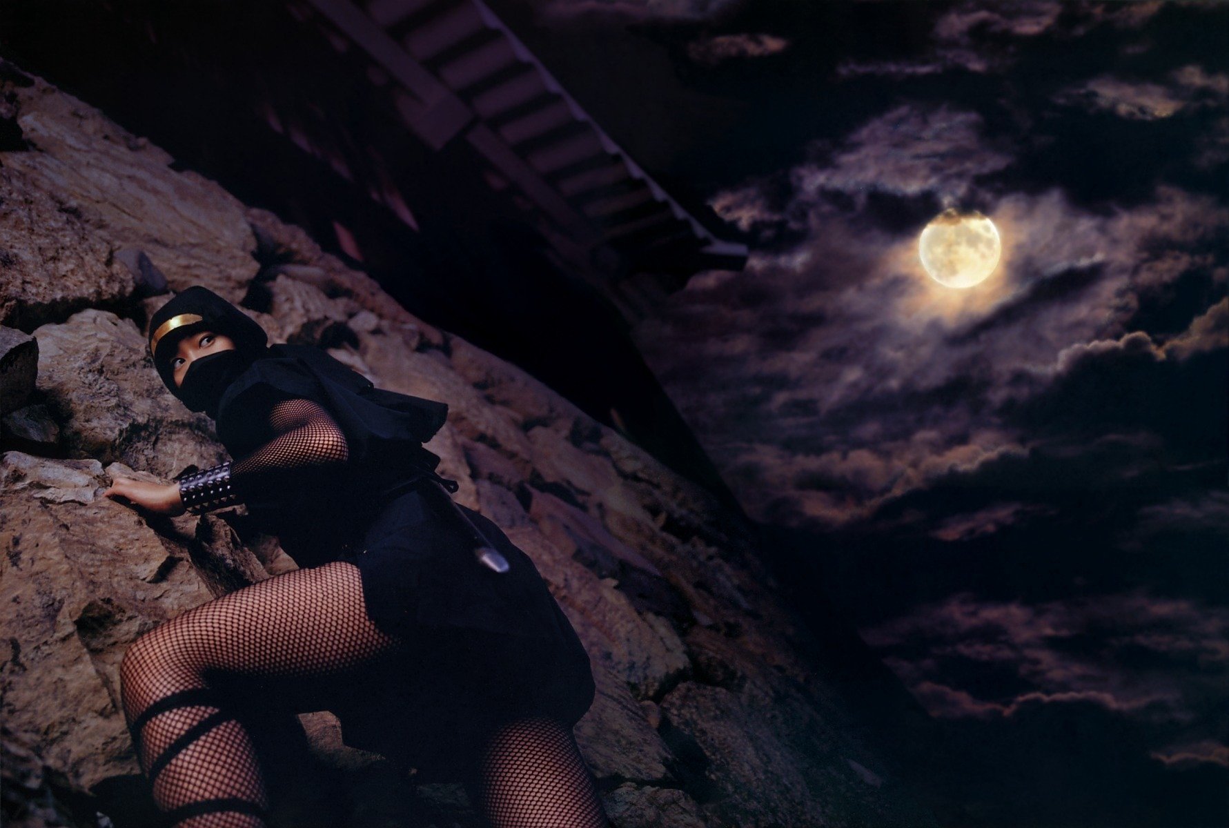 Ein ninja in einem schwarzen anzug mit einem dolch versteckte sich in einem hinterhalt, bereit zu schlagenEin Ninja in einem schwarzen Anzug mit einem Dolch versteckte sich in einem Hinterhalt, bereit zu schlagen