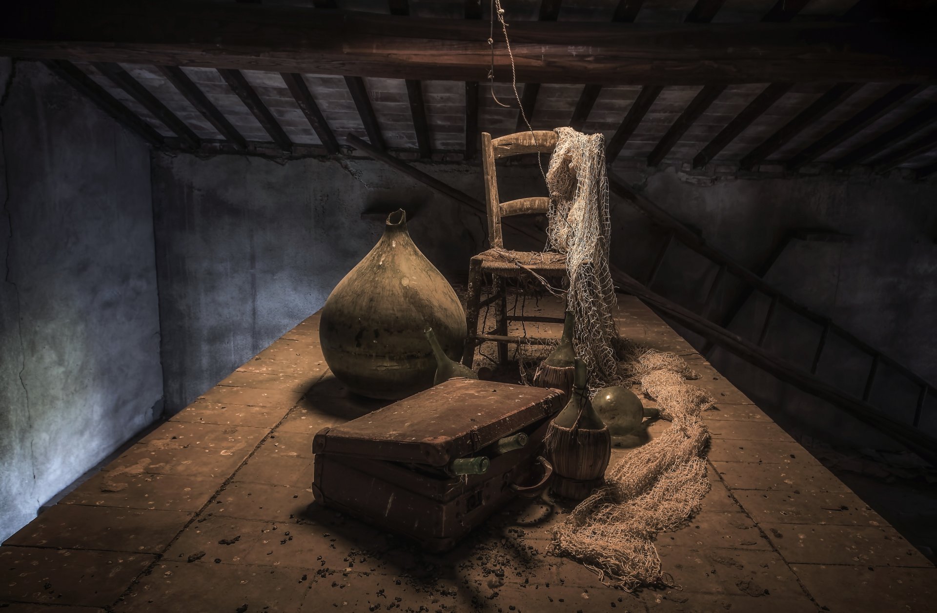 Stuhl mit Netz und Koffer auf dem Dachboden