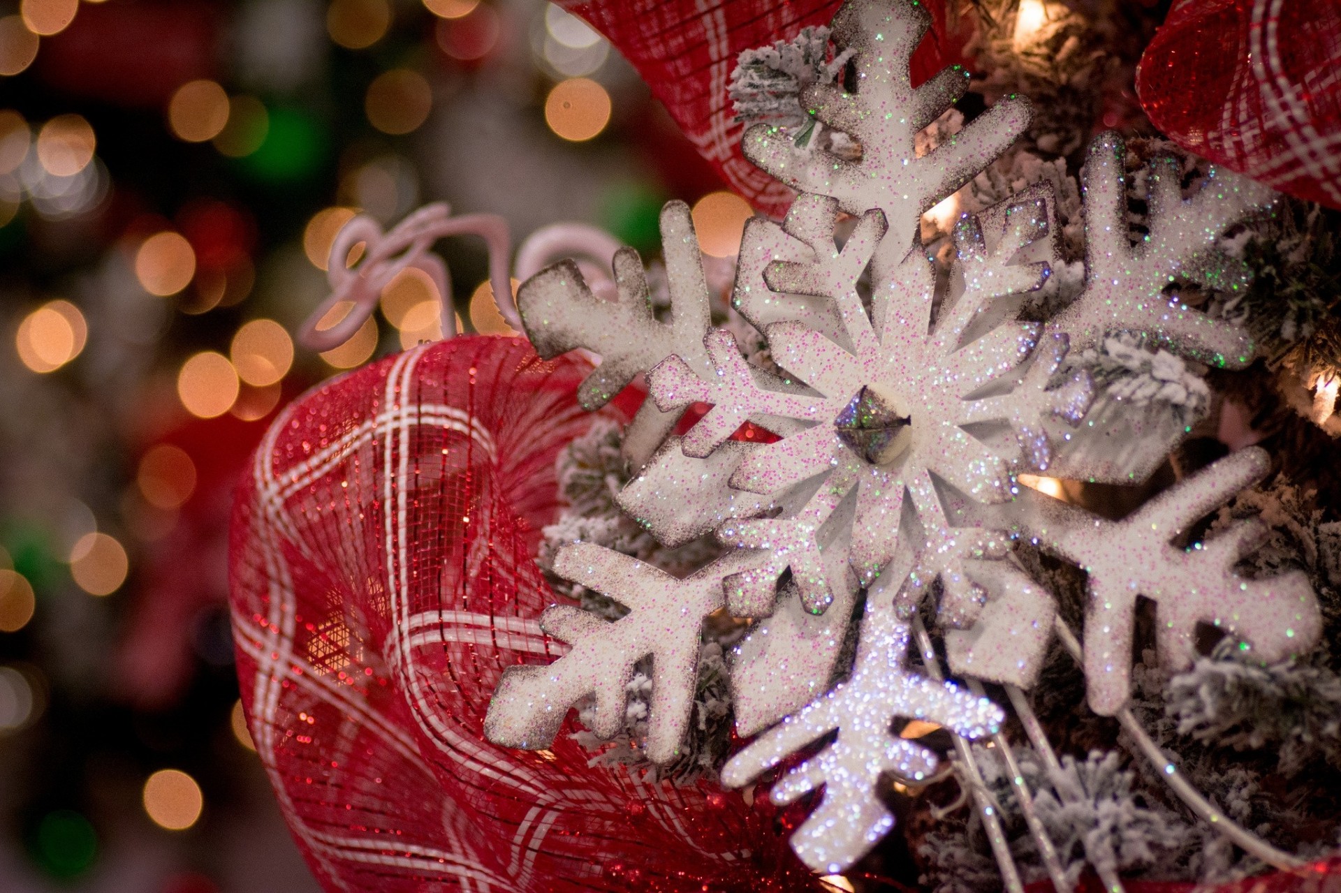 Dekor für das neue Jahr. Schöne blaue Kugeln mit weißen Mustern. Weiße und silberne Schneeflocken mit silbriger Girlande