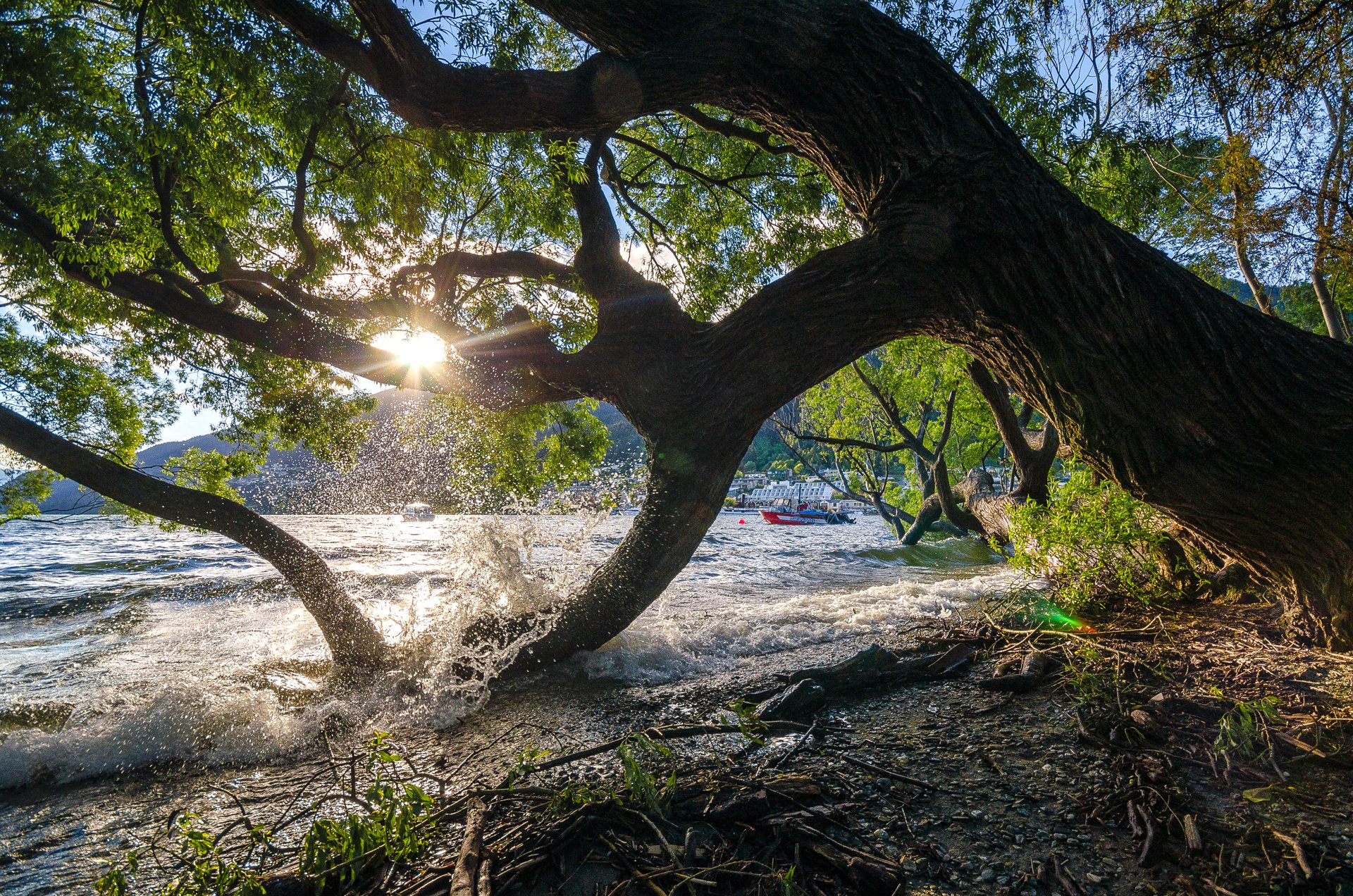 Ein See in Neuseeland mit blauem Wasser, bewachsenen Ufern und von Bergen umgeben