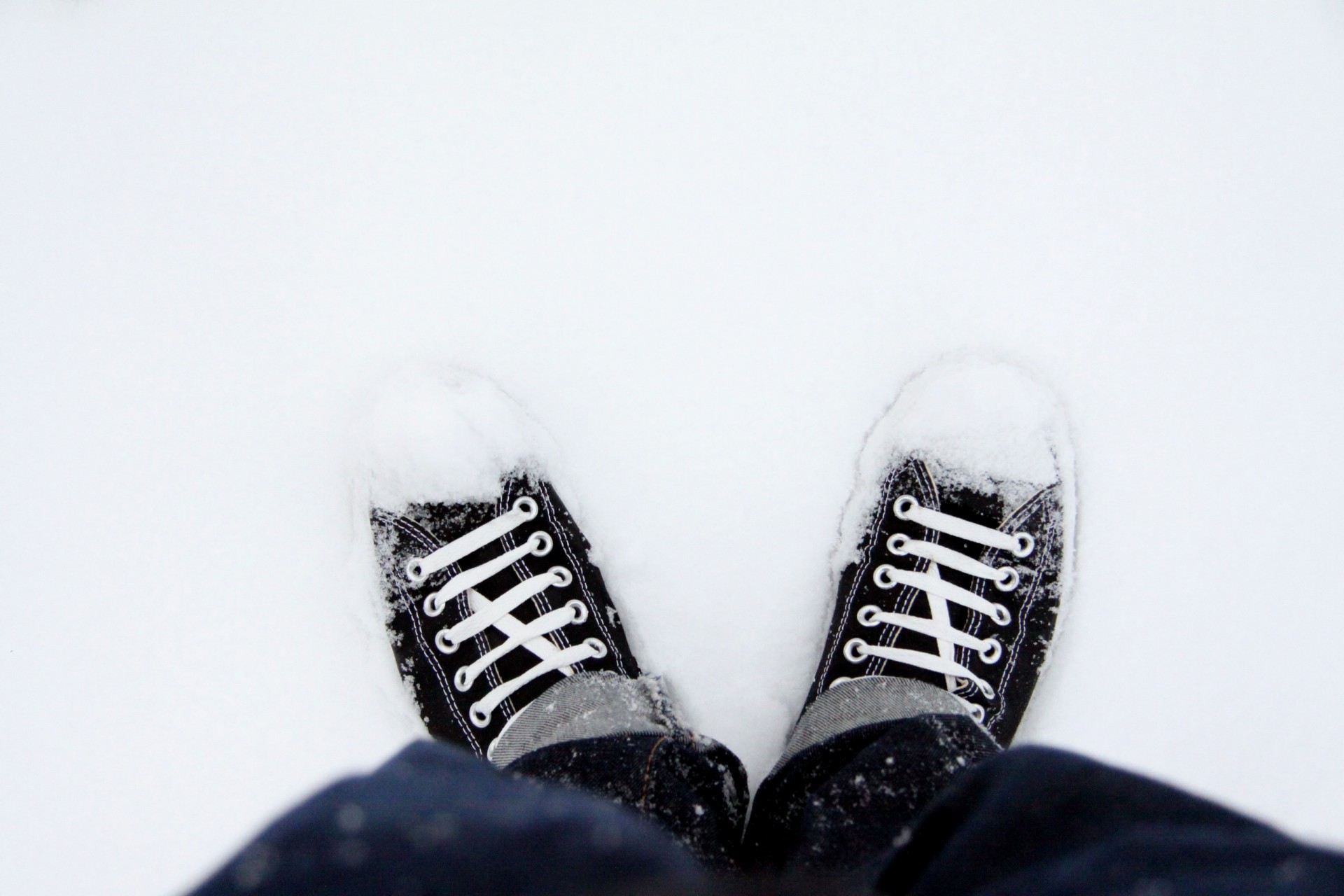 Turnschuhe für Männer, die mit Schnee bedeckt sind