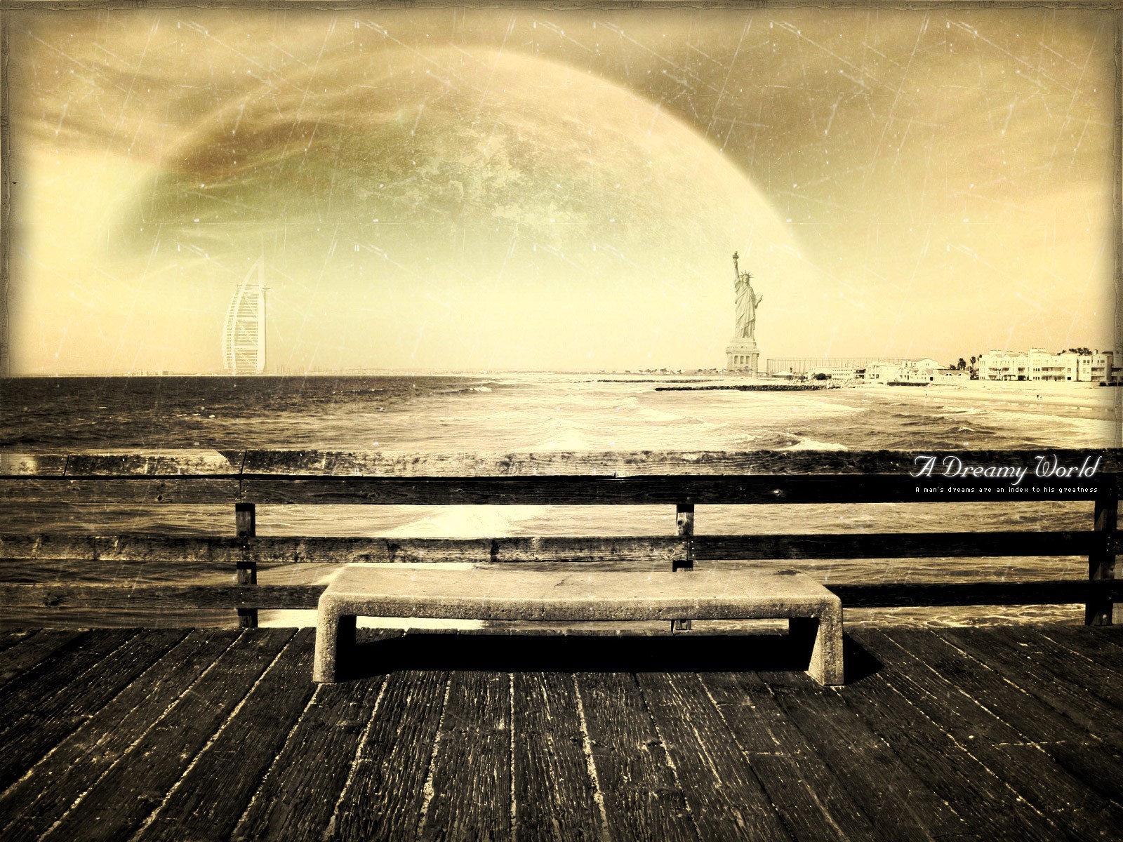 Blick von der uferpromenade auf den fluss und die statueBlick von der Uferpromenade auf den Fluss und die Statue