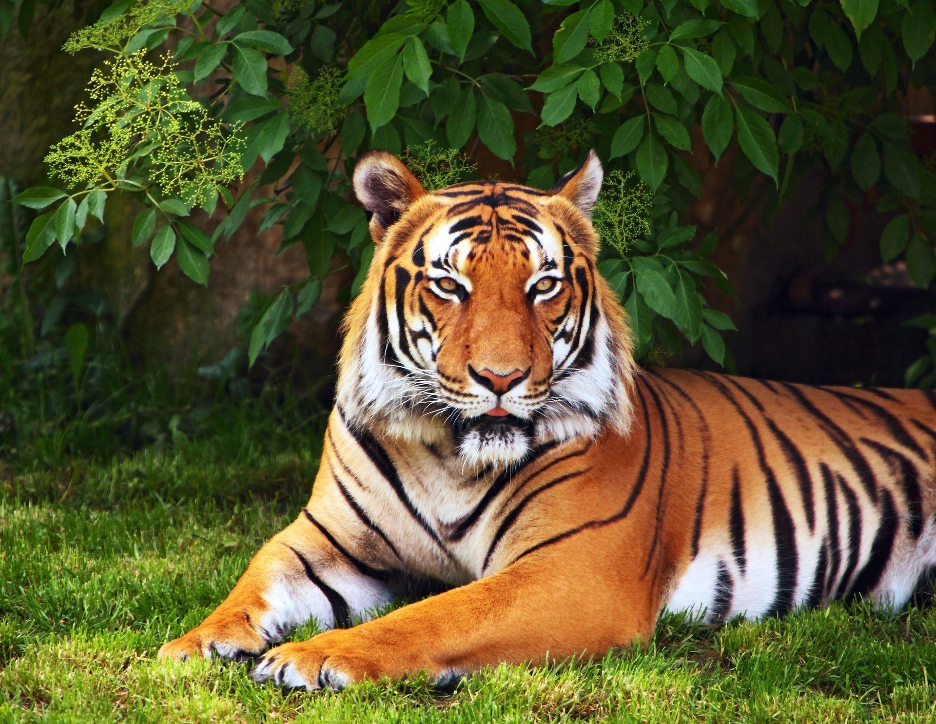 Ein gefürchteter Tiger ruht inmitten einer dichten grünen Vegetation