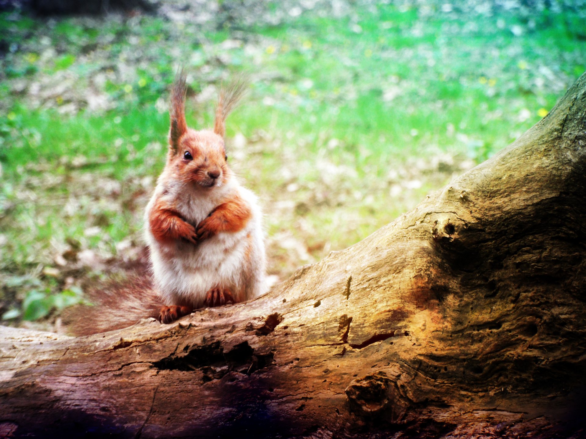 Ein kleines flauschiges eichhörnchen sitzt auf einem umgestürzten baumEin kleines flauschiges Eichhörnchen sitzt auf einem umgestürzten Baum
