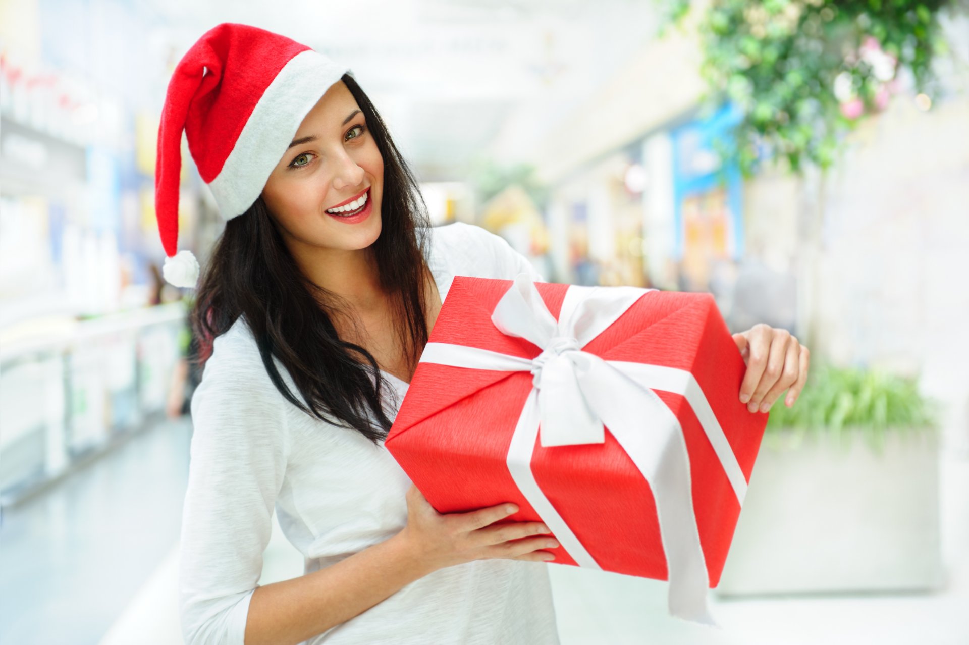 Mädchen in einer Neujahrskappe mit einem Geschenk in der Hand