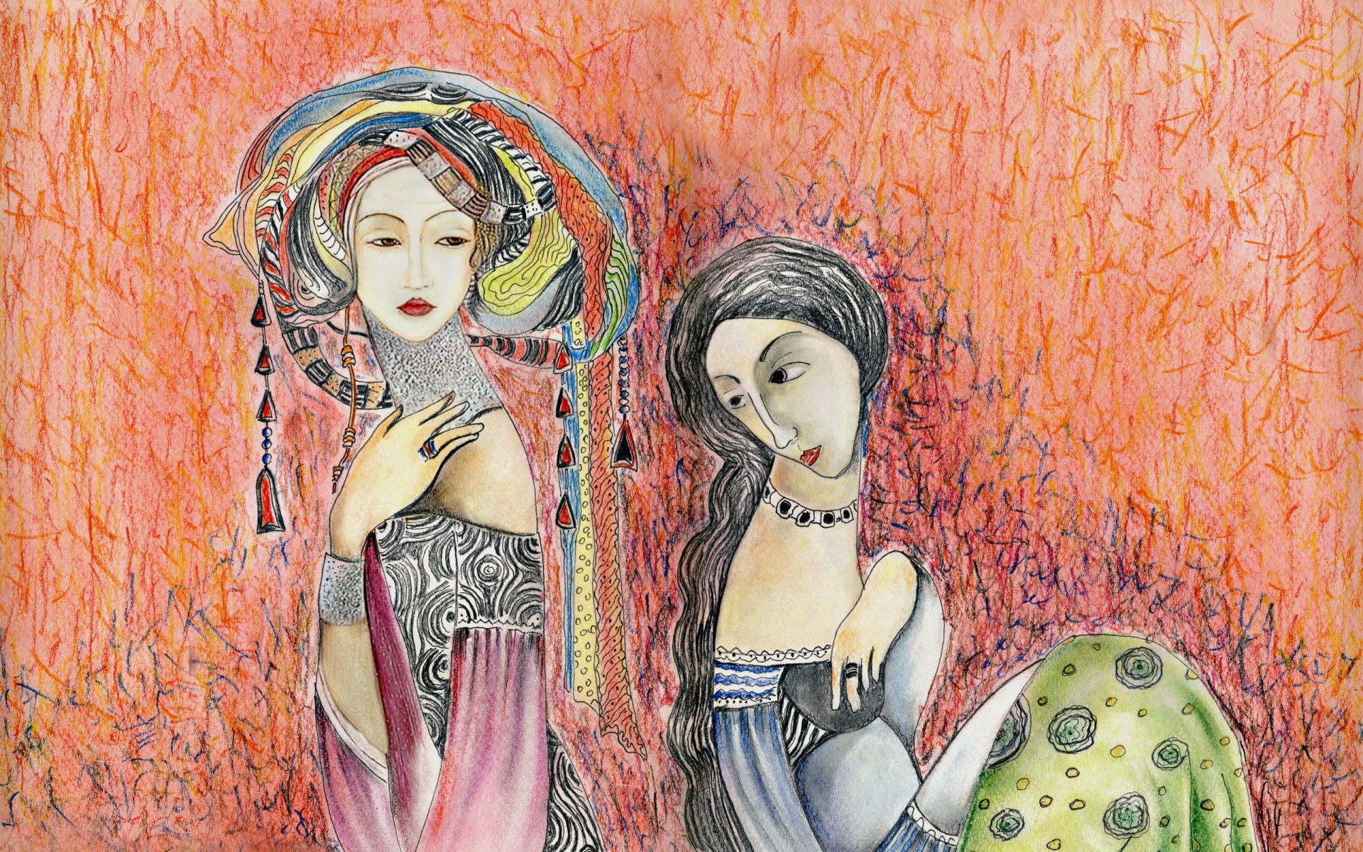 Schöne dame in rot und dekolleté vor dem hintergrund des dorfesSchöne Dame in rot und Dekolleté vor dem Hintergrund des Dorfes
