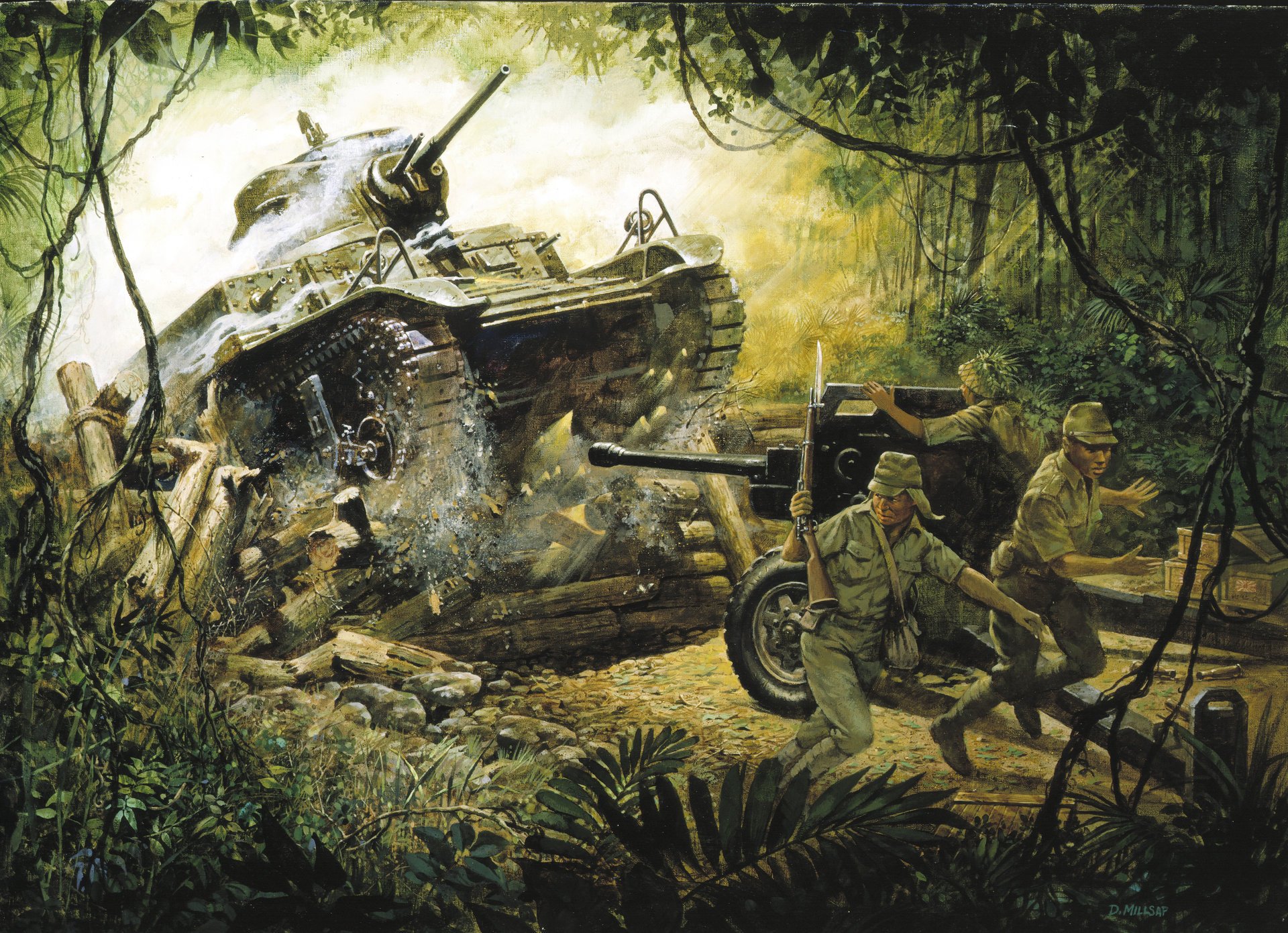 Japaner im Krieg zwischen Dickicht mit Panzer und Kanone