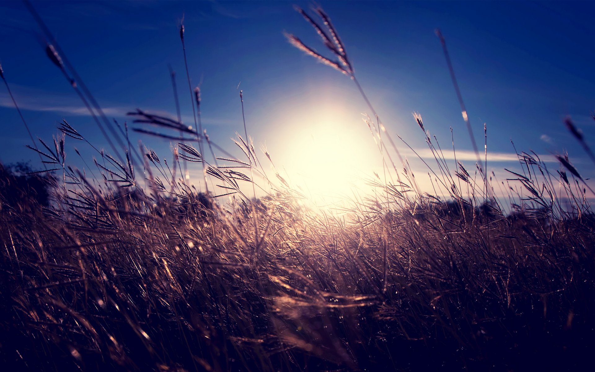 Sonnenuntergang im trockenen grasfeld vor dem hintergrund des blauen himmelsSonnenuntergang im trockenen Grasfeld vor dem Hintergrund des blauen Himmels