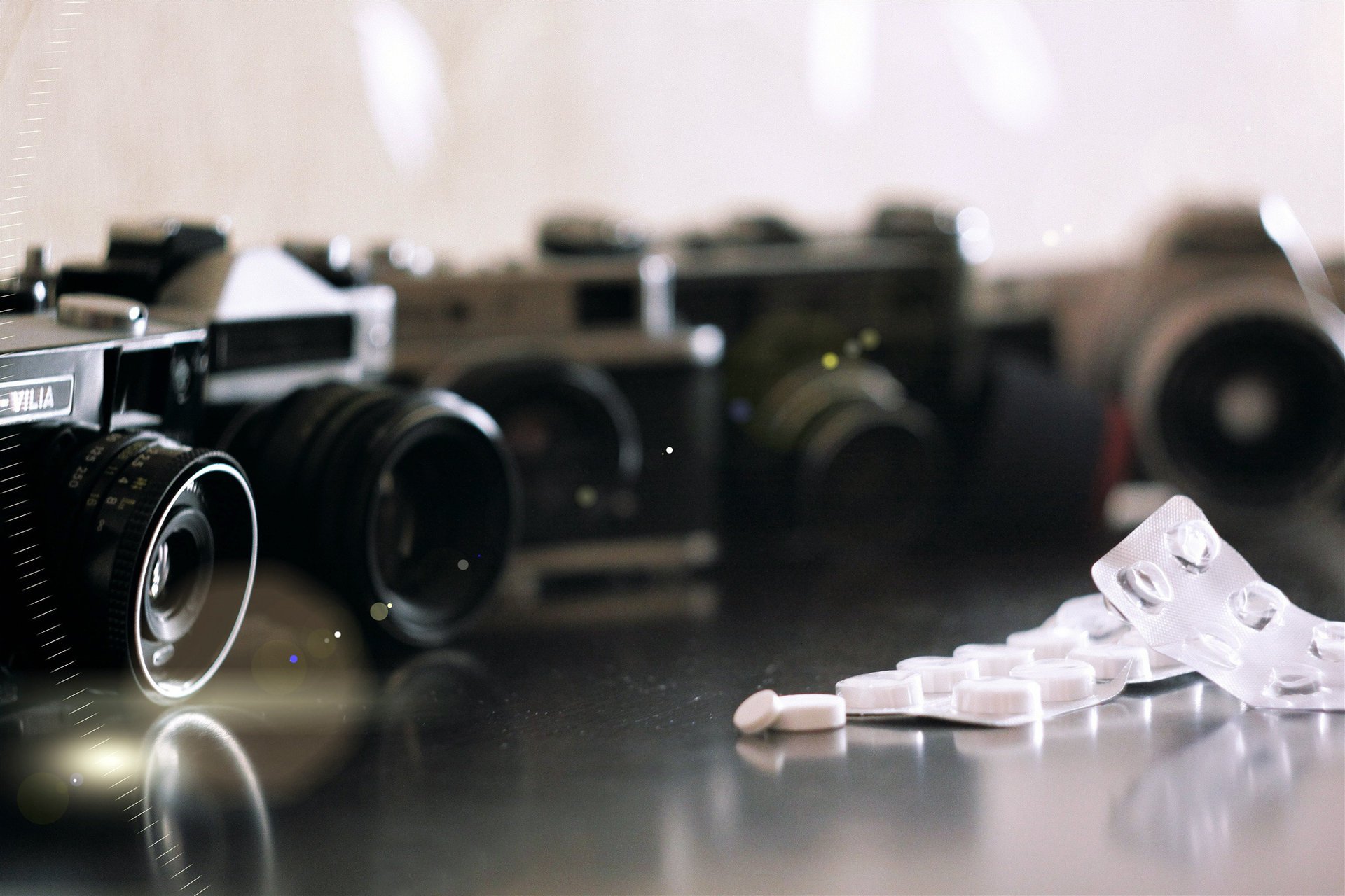 Kameras schießen eine Reihe von Tabletten auf dem Tisch ab