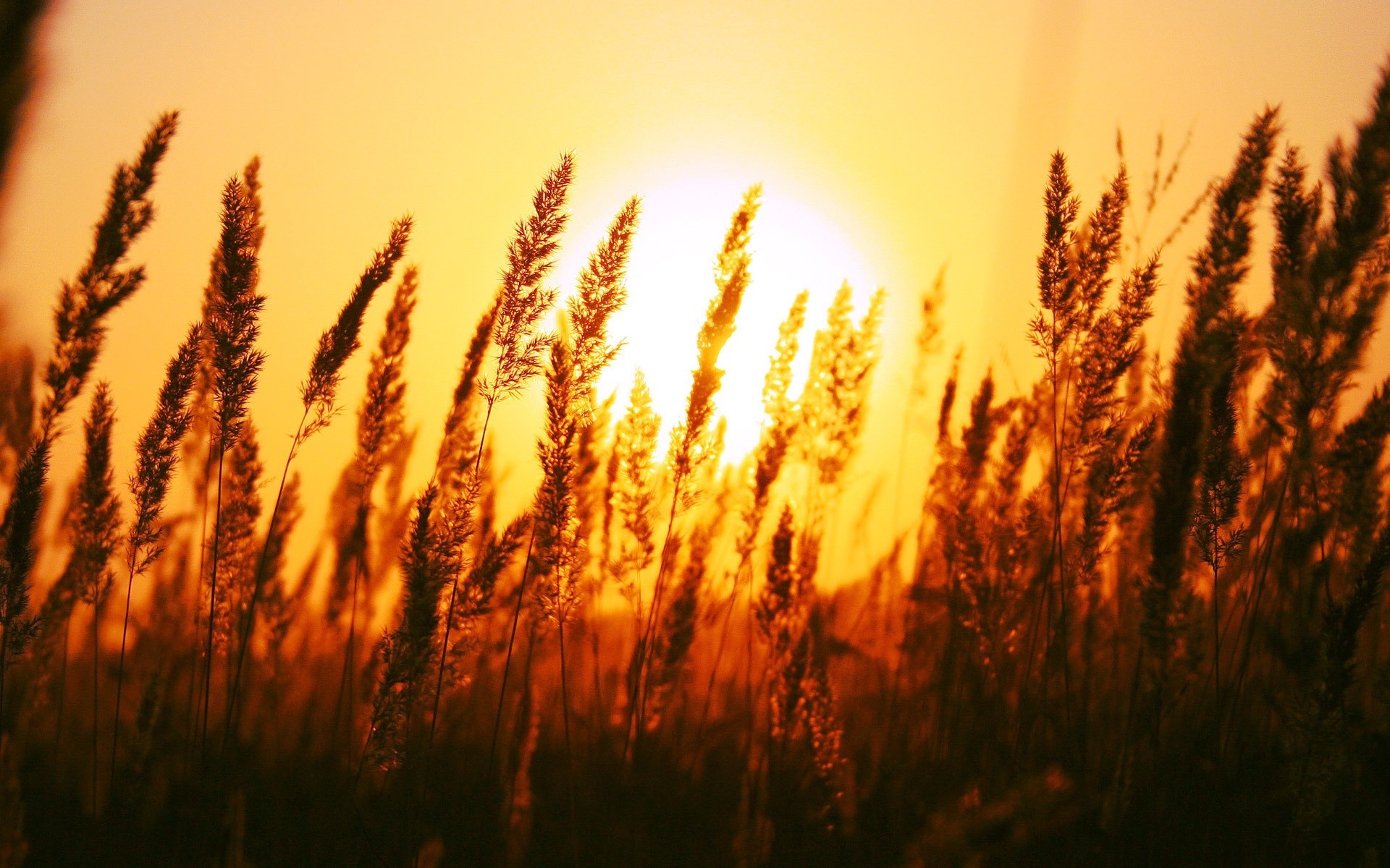 Die helle orangefarbene Sonne blickt durch die Ähren auf dem Feld