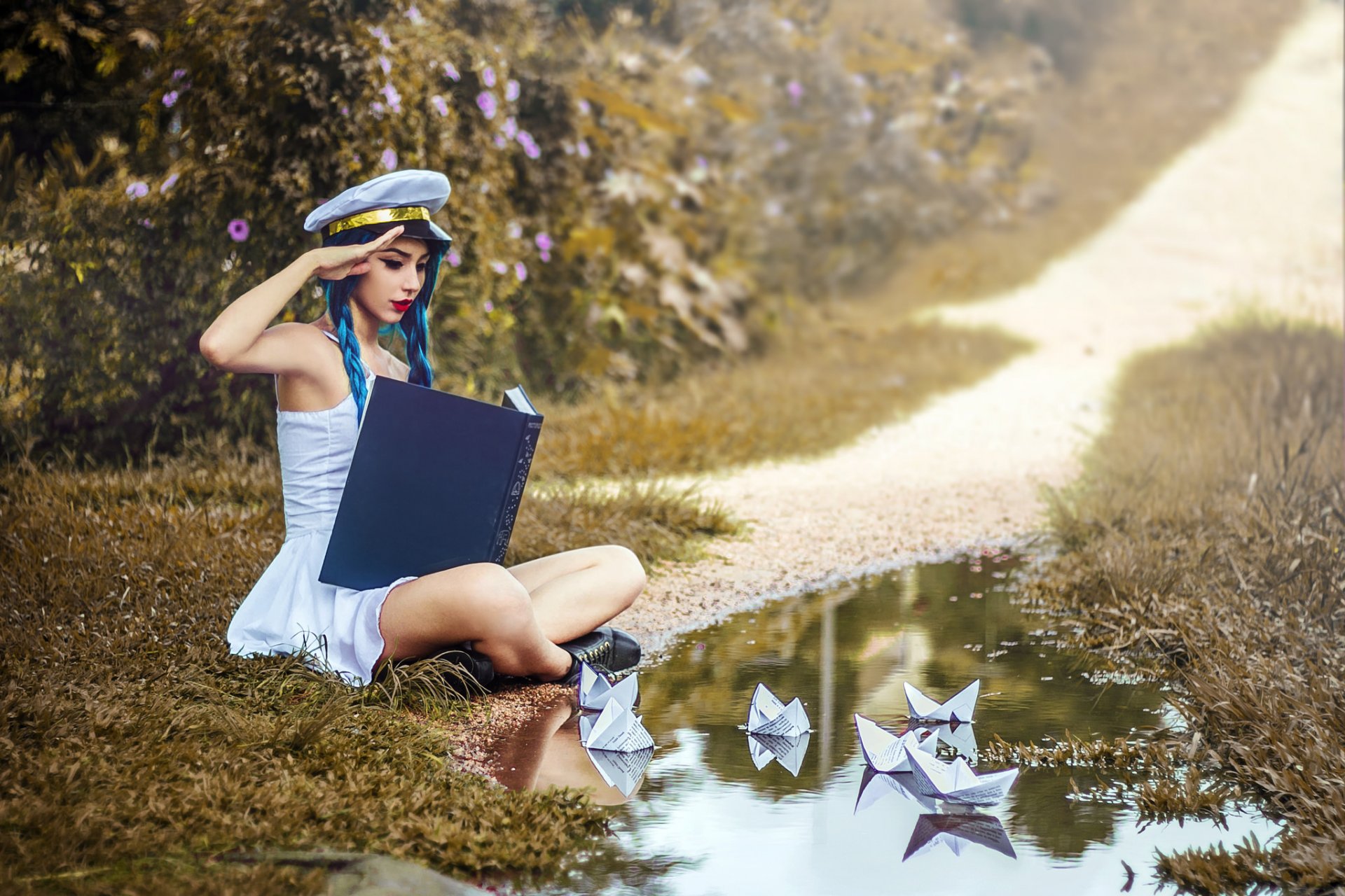 Das Mädchen spielt, in einer Pfütze aus Papierschiffen, das Mädchen in der Schirmmütze des Kapitäns
