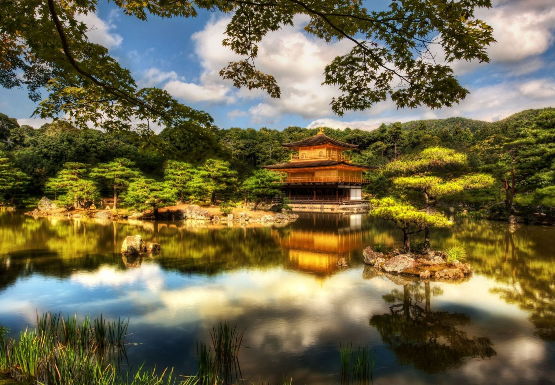 Das Gold der Pagoden des japanischen Tempels spiegelt sich in Gewässern und Wolken wider