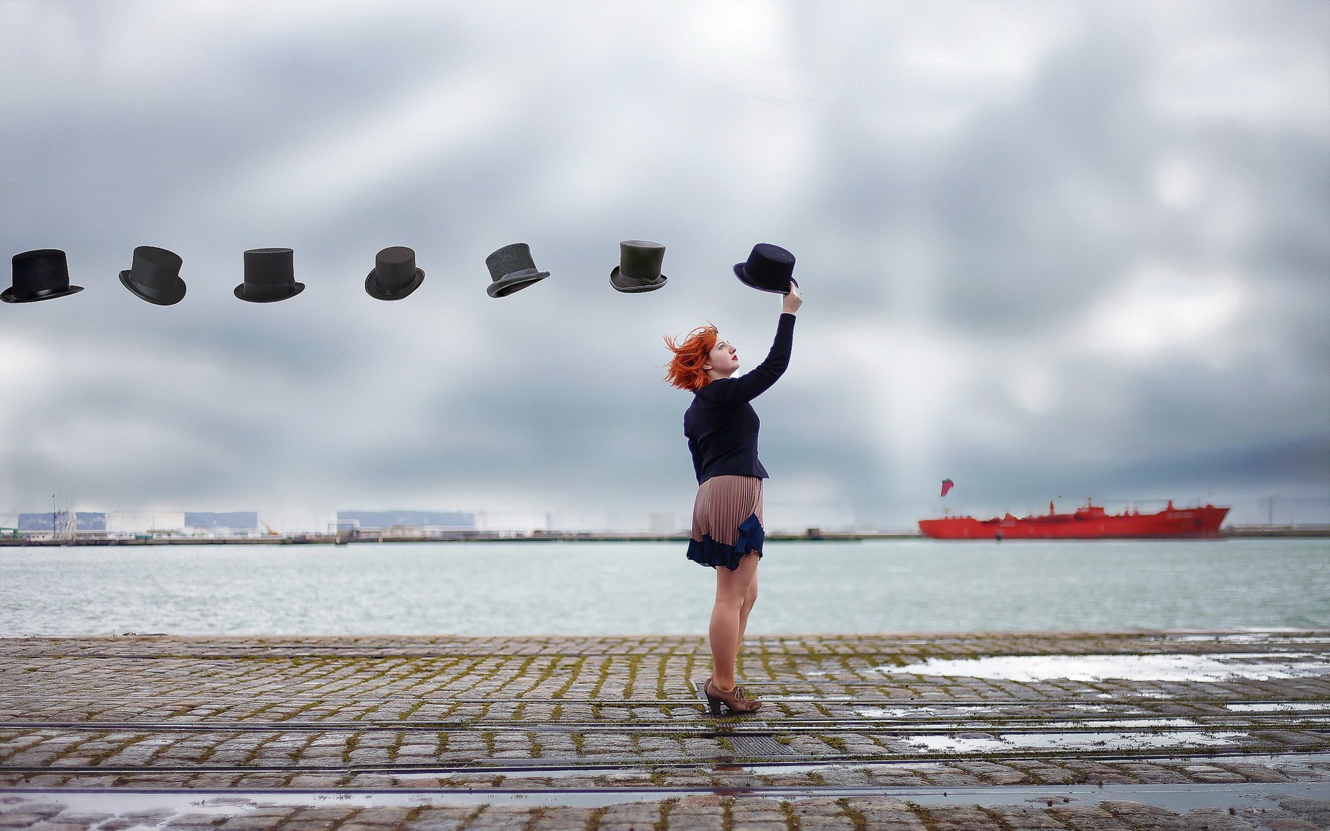 Ein mädchen in einer motorradbrille schaut auf eine seifenblase, in der ein blauer schmetterling eingeschlossen istEin Mädchen in einer Motorradbrille schaut auf eine Seifenblase, in der ein blauer Schmetterling eingeschlossen ist