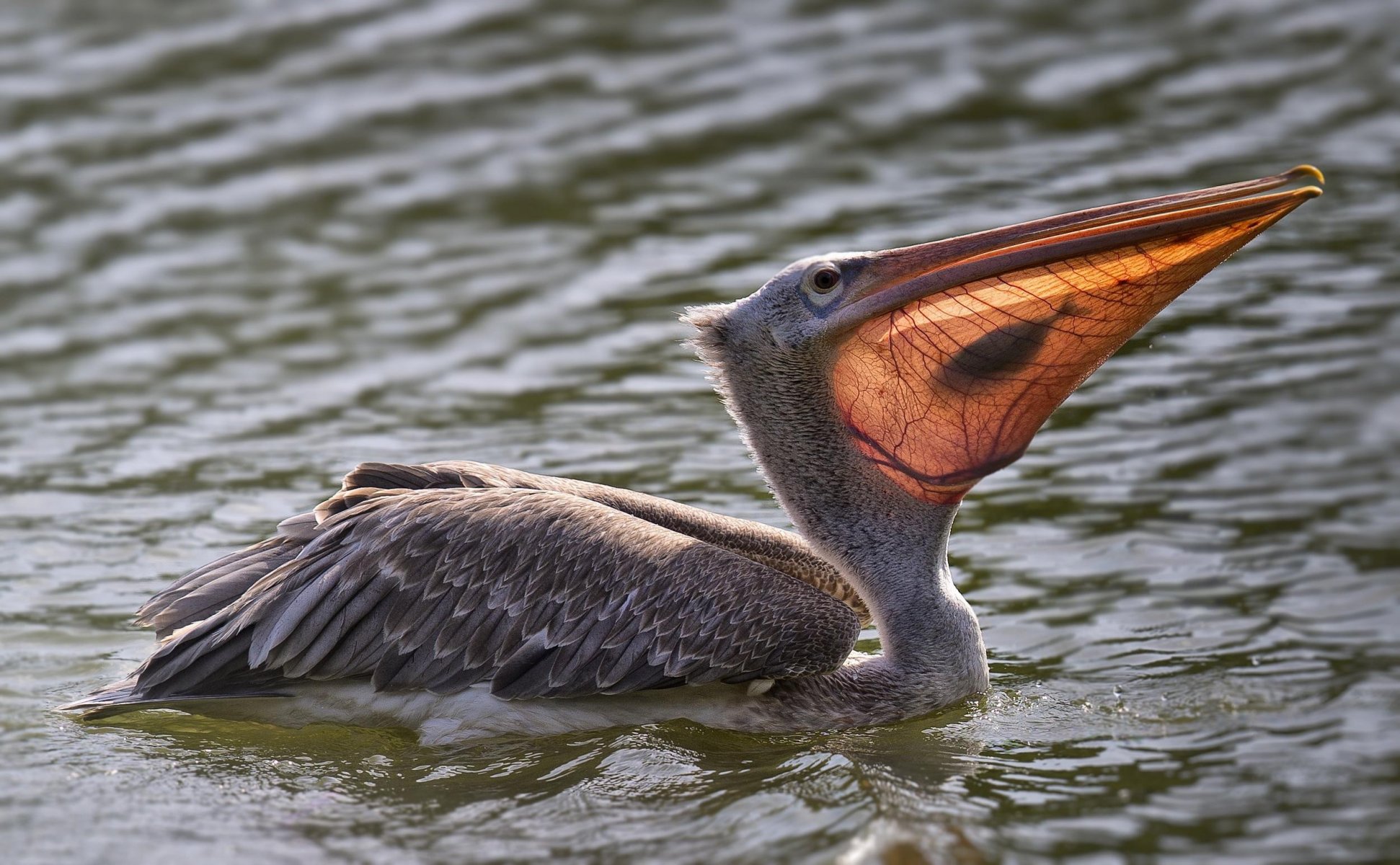 Pelikan im Wasser mit gefangenem Fisch