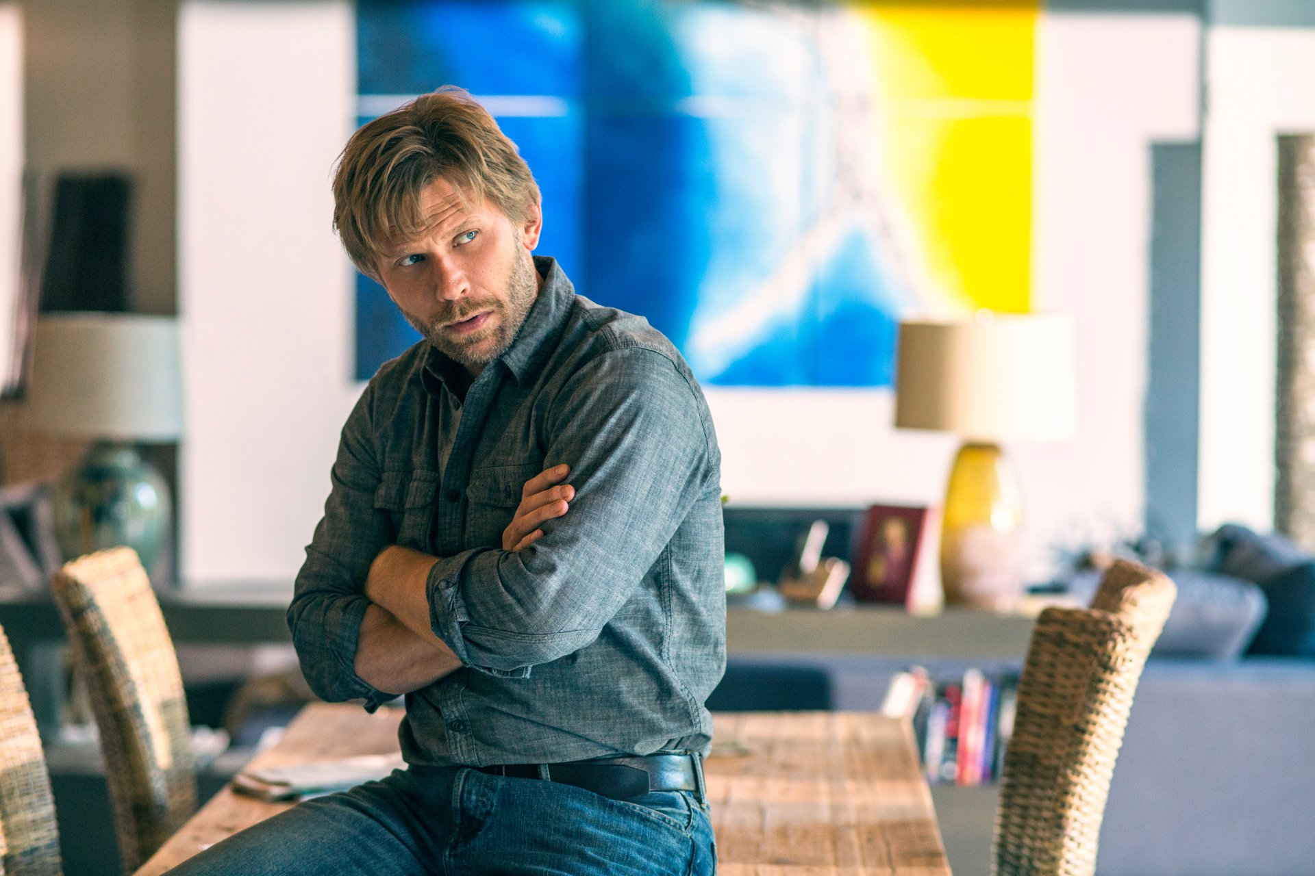 Ein Mann sitzt auf einem Tisch und wackelt in die Ferne