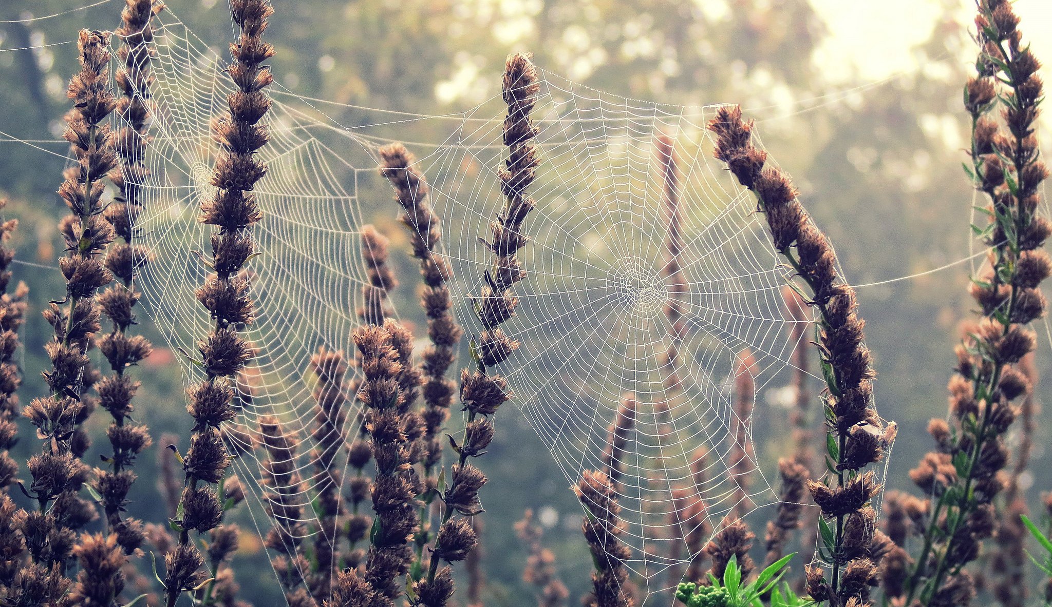 Spinnweben, die auf den blumen der pflanzen gewebt sindSpinnweben, die auf den Blumen der Pflanzen gewebt sind