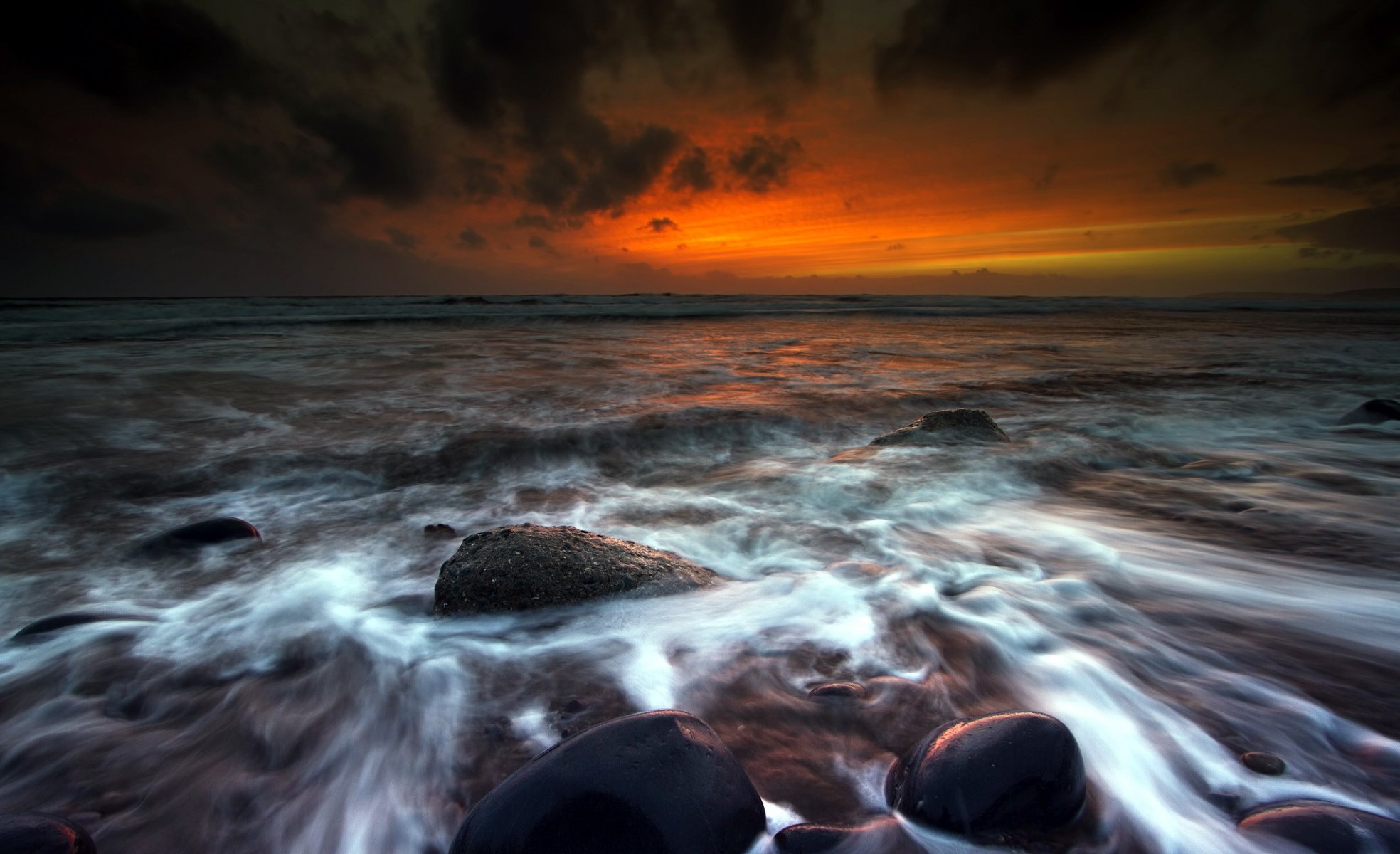 Die wellen schlagen gegen die steine am ufer und am himmel ein gewitterwirbelDie Wellen schlagen gegen die Steine am Ufer und am Himmel ein Gewitterwirbel