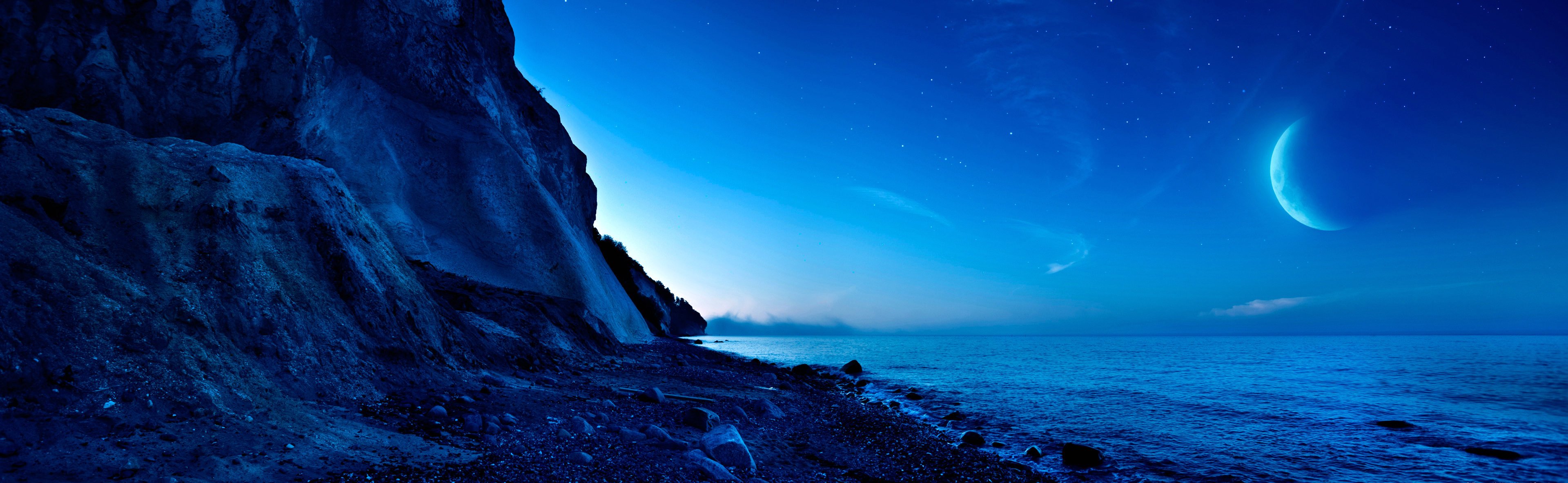 Mond am Nachthimmel über Wasser und Berg