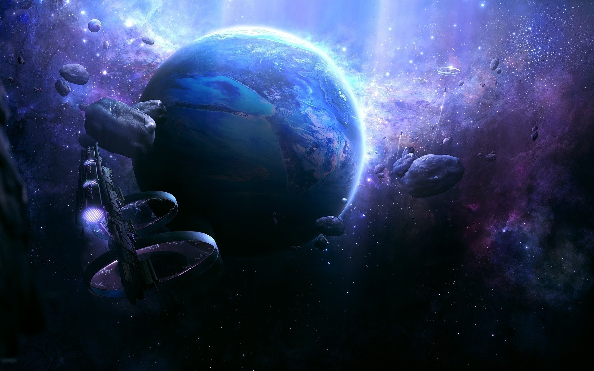 Ein Planet, der von Asteroiden und einem Raumschiff umgeben ist