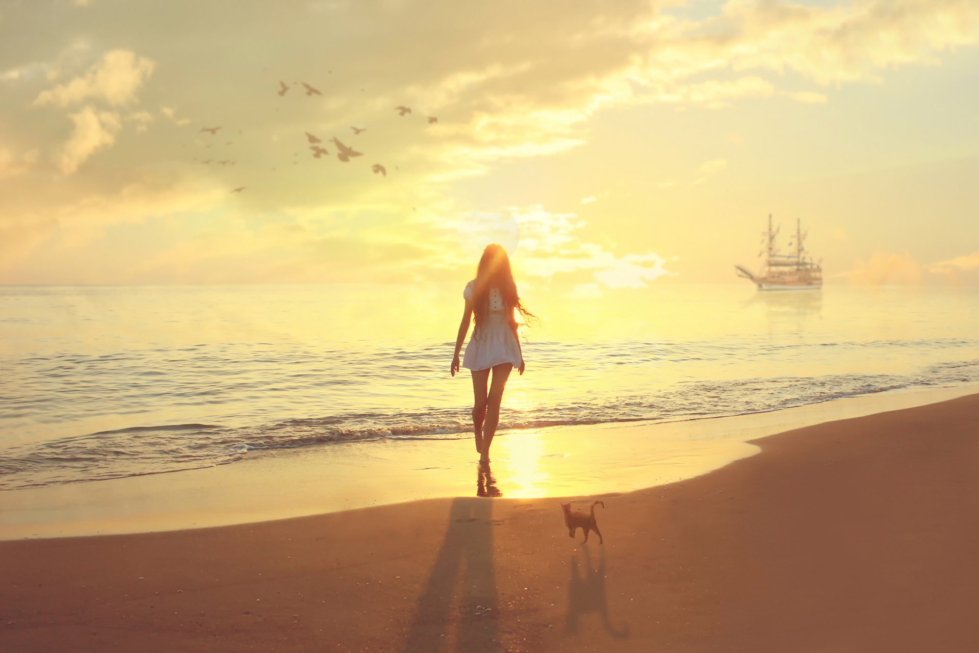 Mädchen mit einer Katze auf dem Hintergrund des Meeres mit einem Segelboot
