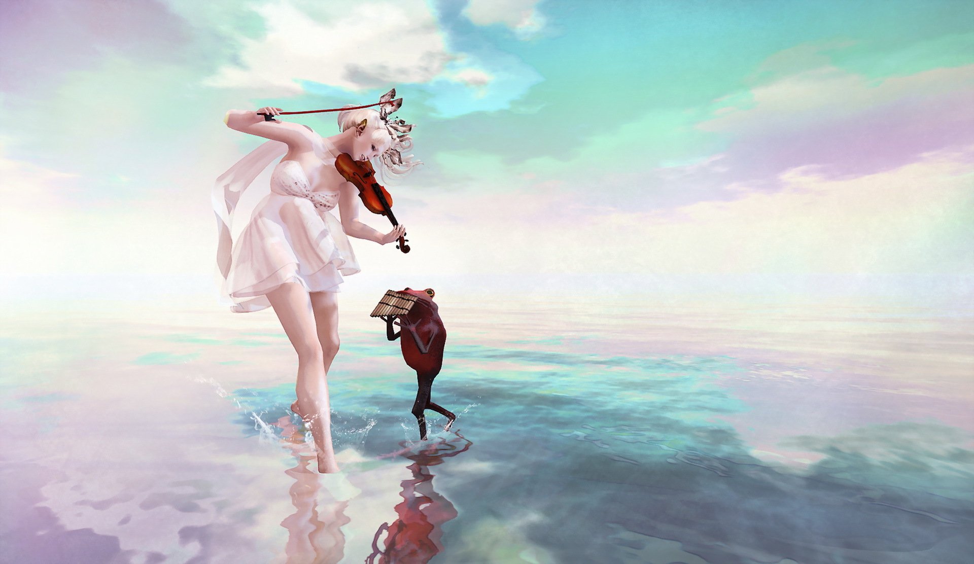 Mädchen-geigerin bei einem treffen mit einem froschMädchen-Geigerin bei einem Treffen mit einem Frosch