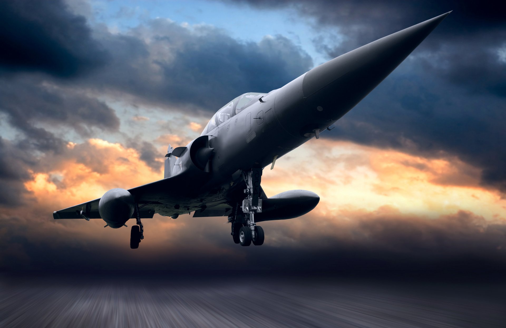 Schönes Militärflugzeug auf einem Hintergrund von Wolken