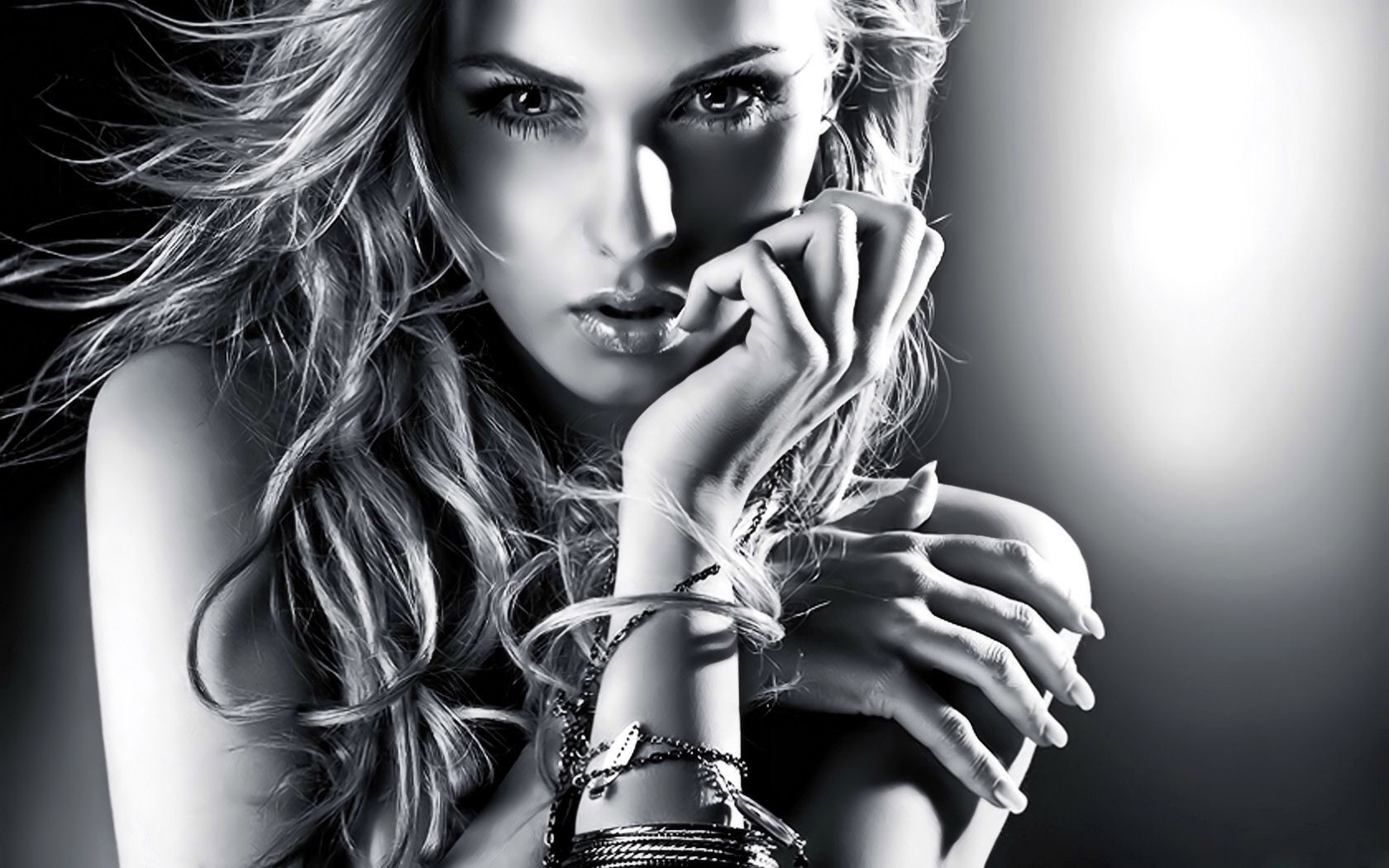 Eine junge braunhaarige Frau mit ernstem Gesicht posiert seitlich des Rahmens in Schwarz-Weiß