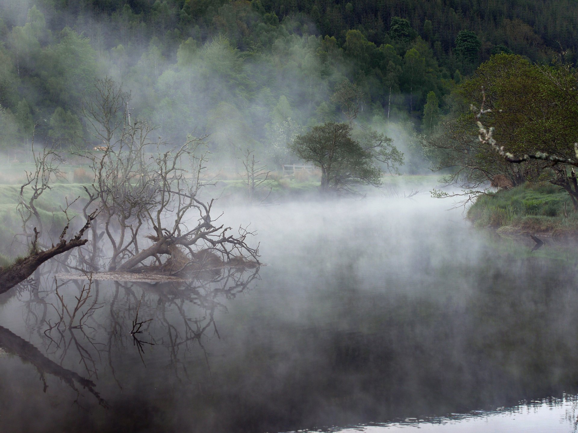 Treibholz in einem see inmitten eines waldes im nebelTreibholz in einem See inmitten eines Waldes im Nebel