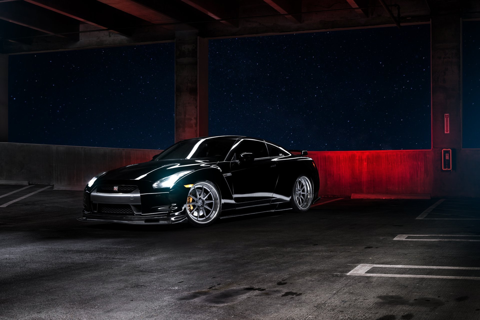 In der Dunkelheit fährt ein weißer Nissan auf der Straße
