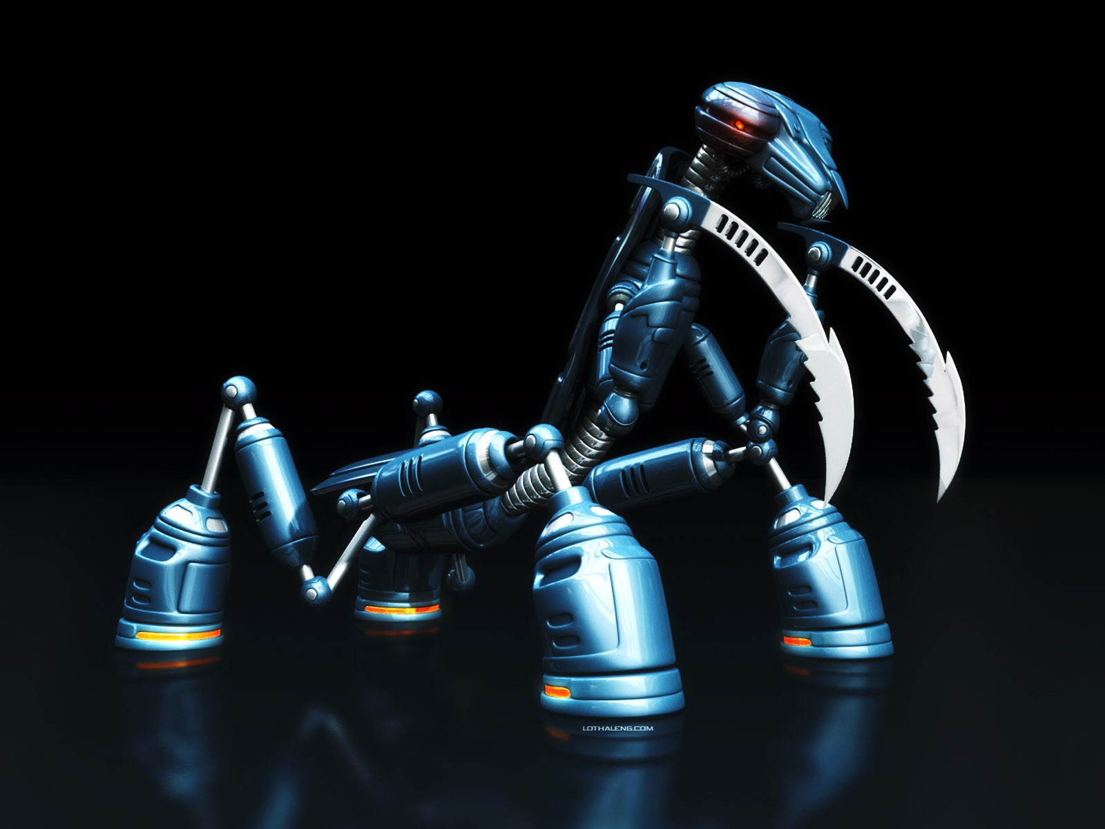 Mantis Roboter aus Metall auf schwarzem Hintergrund