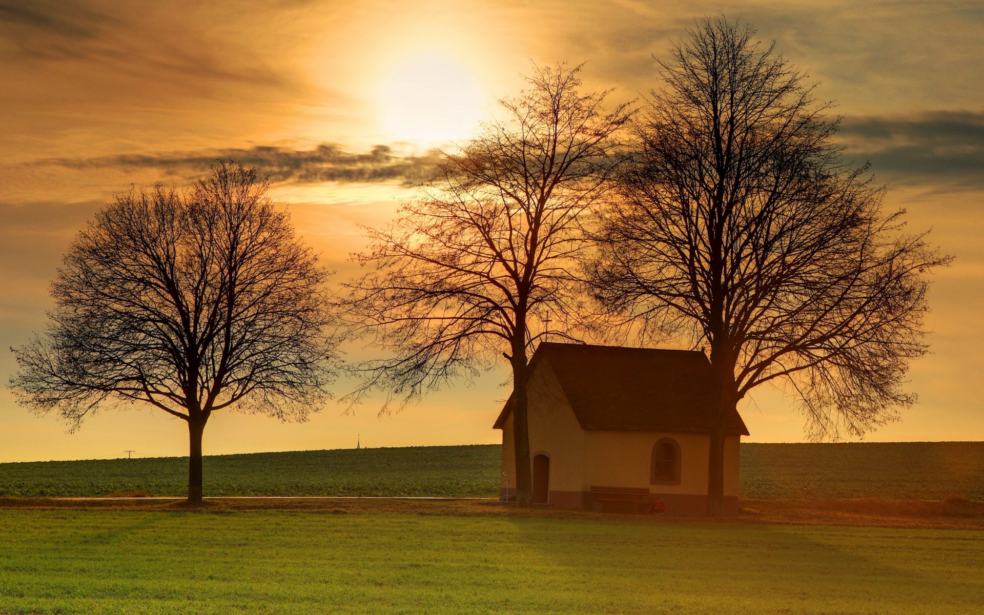 Bäume und ein haus im feld. schöner sonnenuntergang