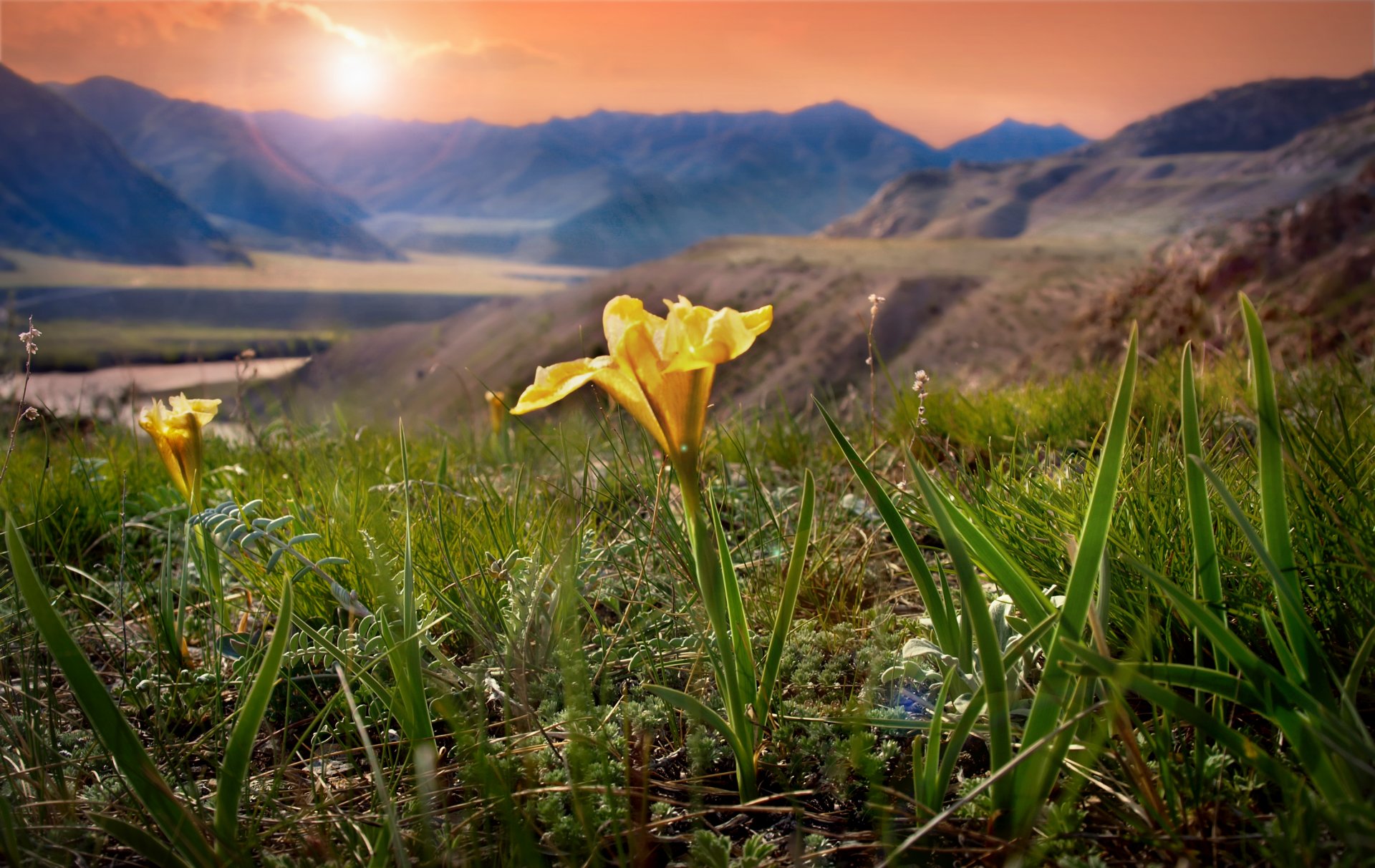 Gelbe blume, junges grünes gras auf dem hintergrund der bergeGelbe Blume, junges grünes Gras auf dem Hintergrund der Berge