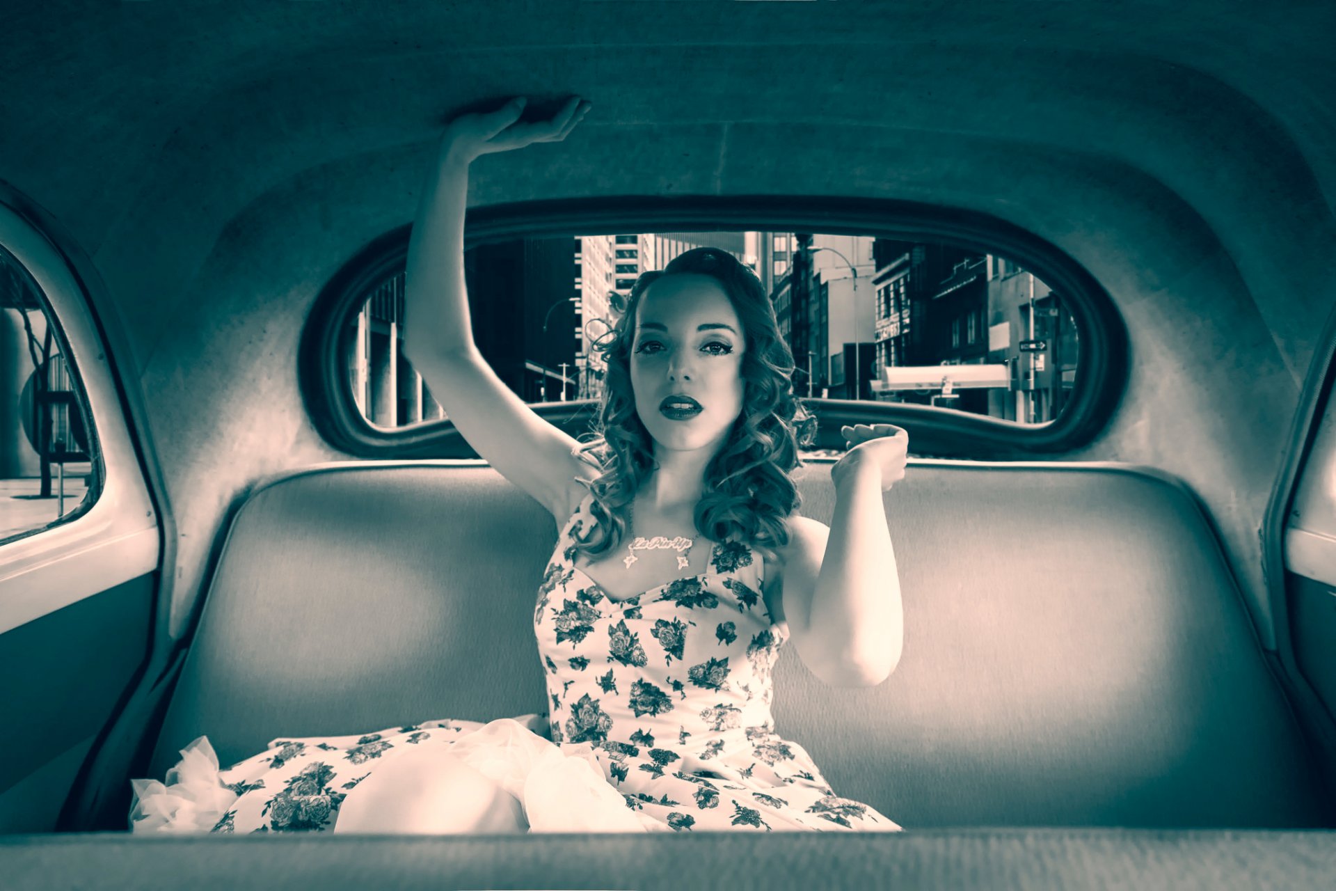 Retro-Bild mit einem Mädchen in einem offenen Outfit und High Heels
