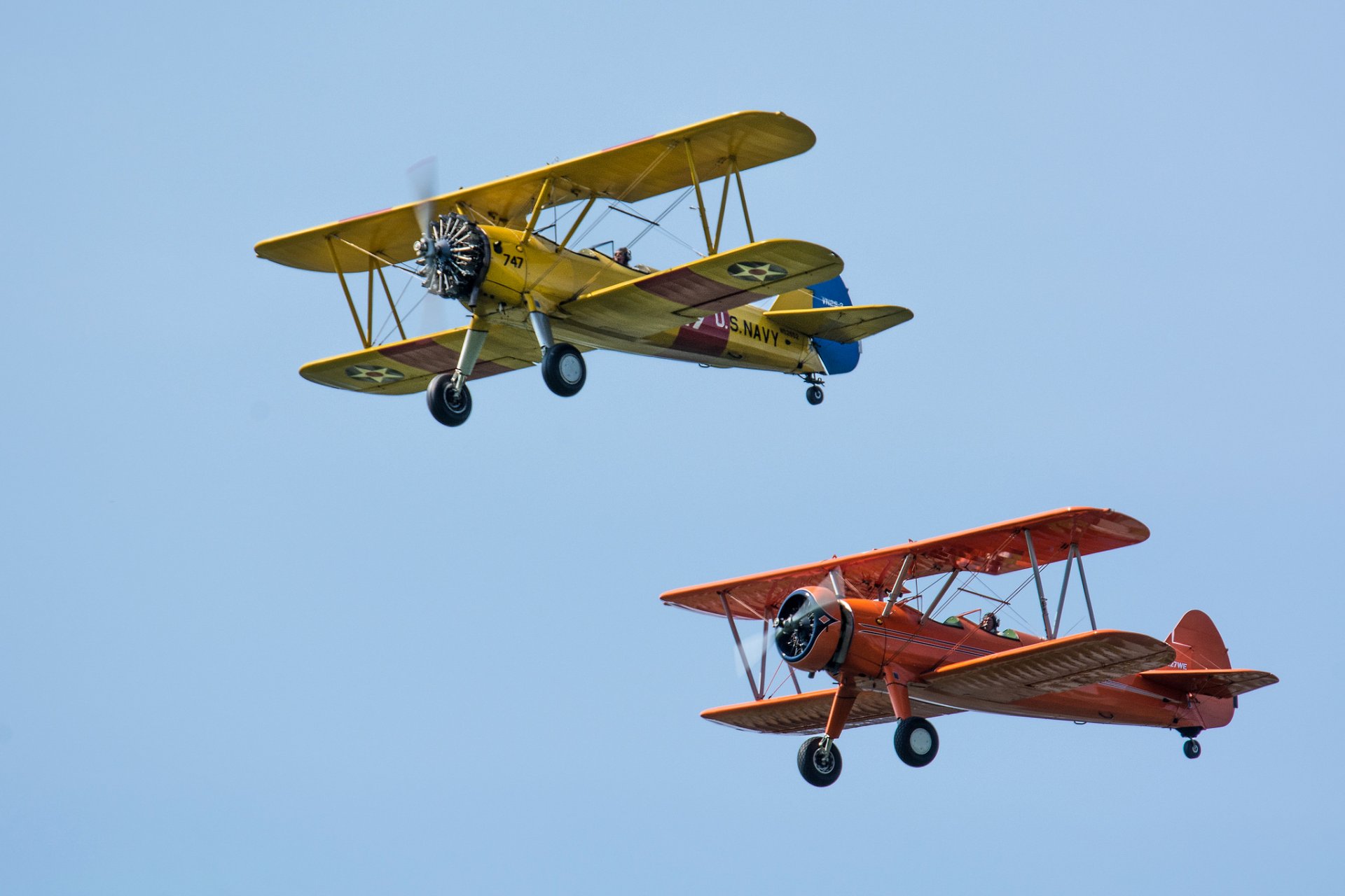 Zwei Retro Doppeldecker auf einem blauen Himmelshintergrund