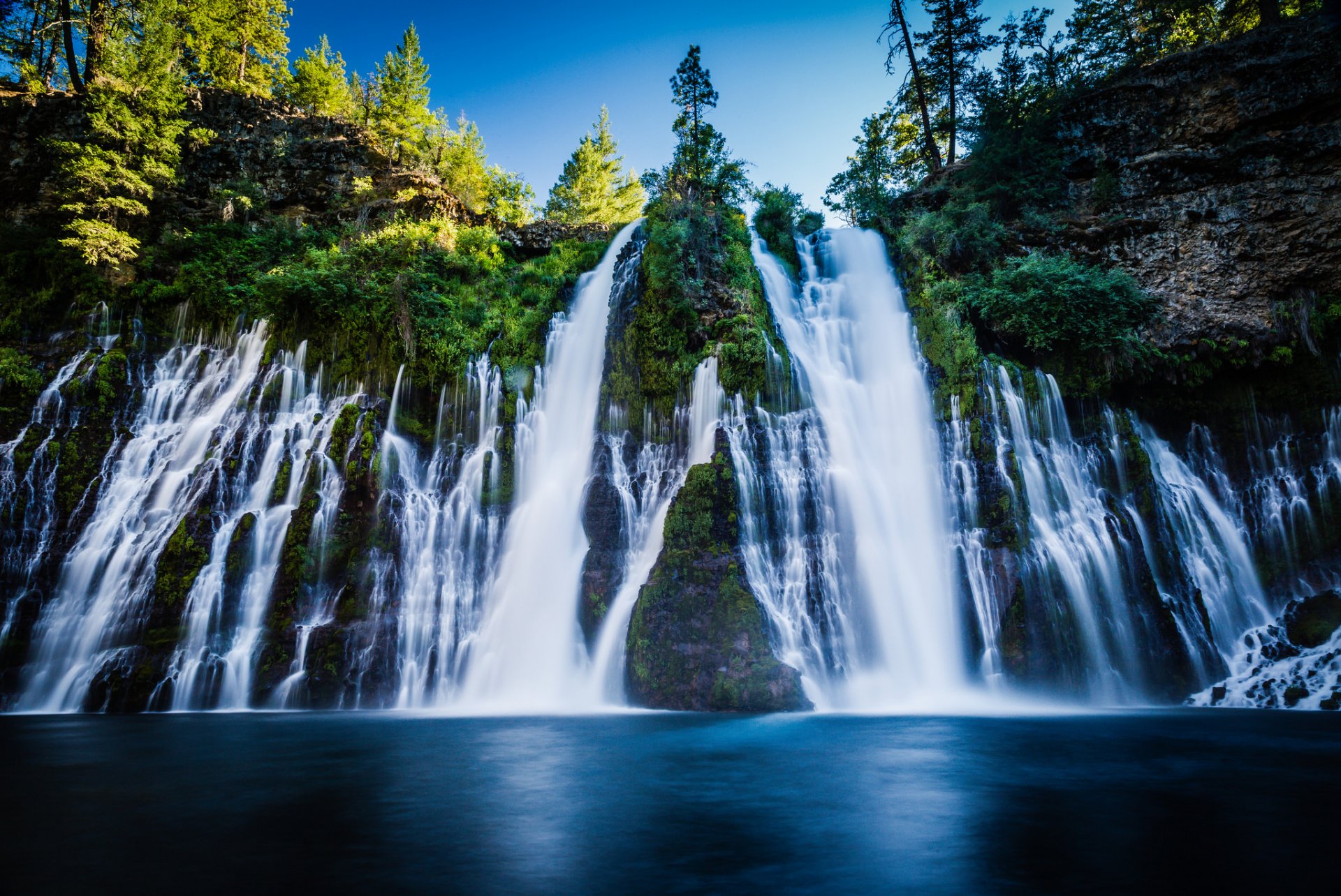 Ein riesiger wasserfall, der von einer klippe in den see fließtEin riesiger Wasserfall, der von einer Klippe in den See fließt