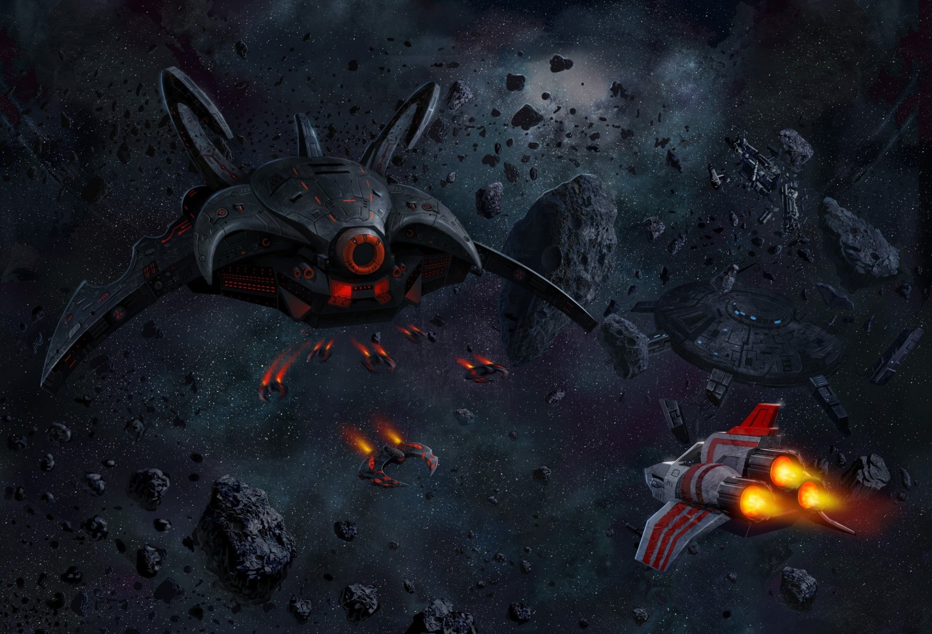 Ein planet, der von asteroiden und einem raumschiff umgeben istEin Planet, der von Asteroiden und einem Raumschiff umgeben ist
