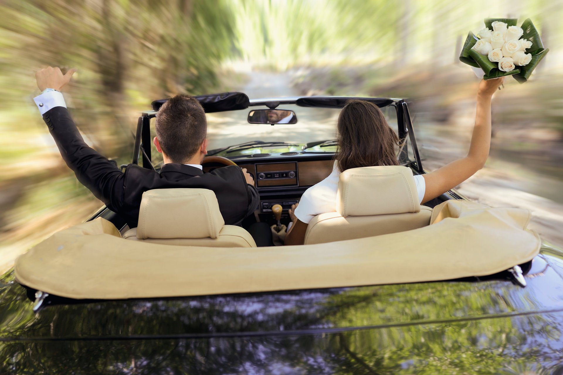 Ein Mann im Anzug und ein Mädchen mit einem Blumenstrauß rasten auf einem Cabrio